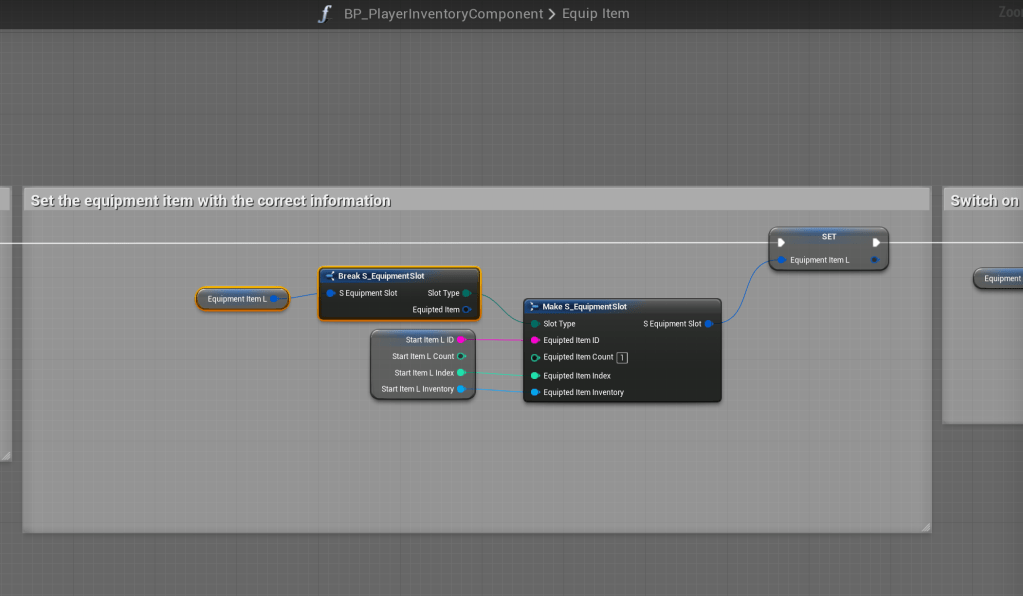 Next go to the BP_PlayerInventoryComponent then create a new function called Find Free Equipment Slot and add 2 outputs, the first set to a Bool and call SpaceFound, the second call EquipmentSlot and set to S_EquipmentSlot. Then add one input called Item In and set it to S_ItemInventory. Now copy the image below.