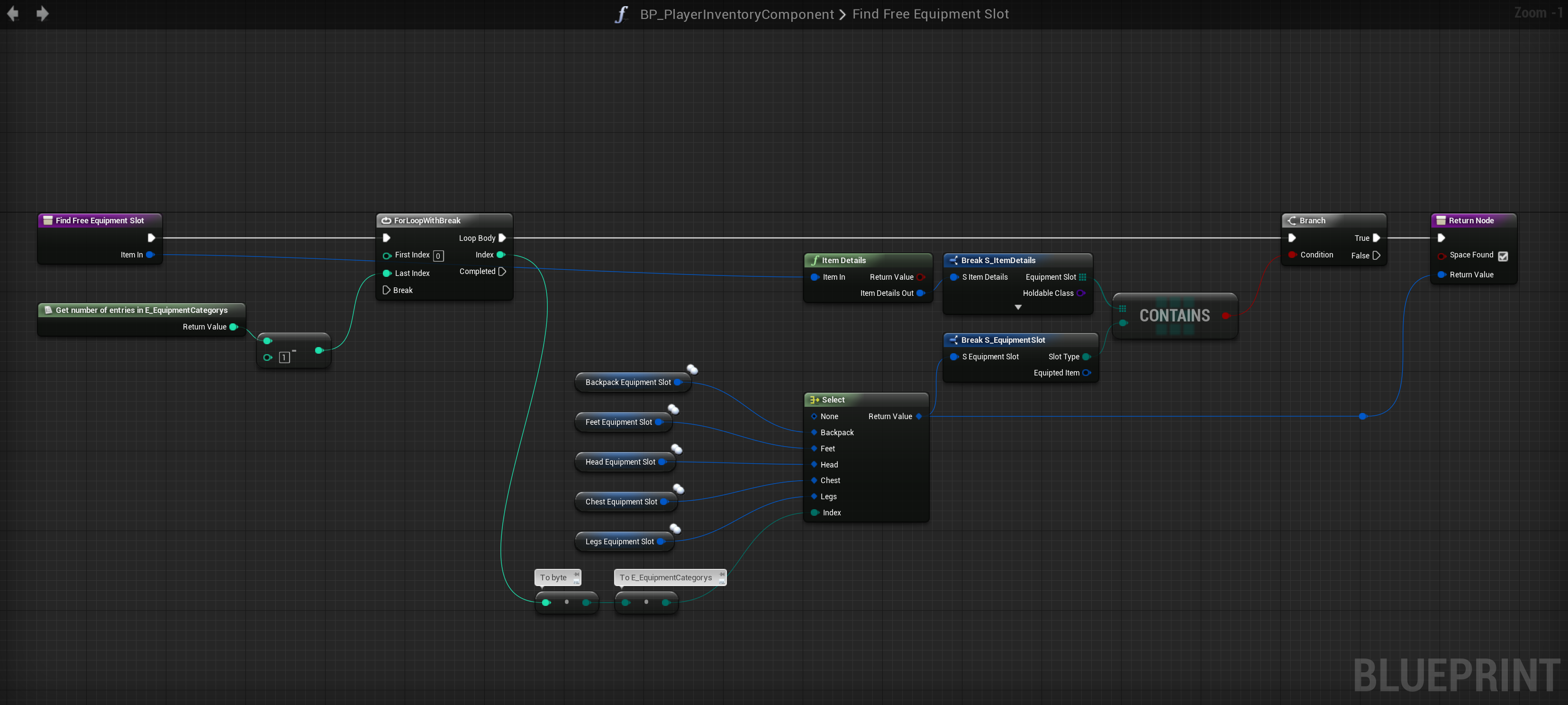 Next go to the BP_PlayerInventoryComponent then create a new function called Find Free Equipment Slot and add 2 outputs, the first set to a Bool and call SpaceFound, the second call EquipmentSlot and set to S_EquipmentSlot. Then add one input called Item In and set it to S_ItemInventory. Now copy the image below.