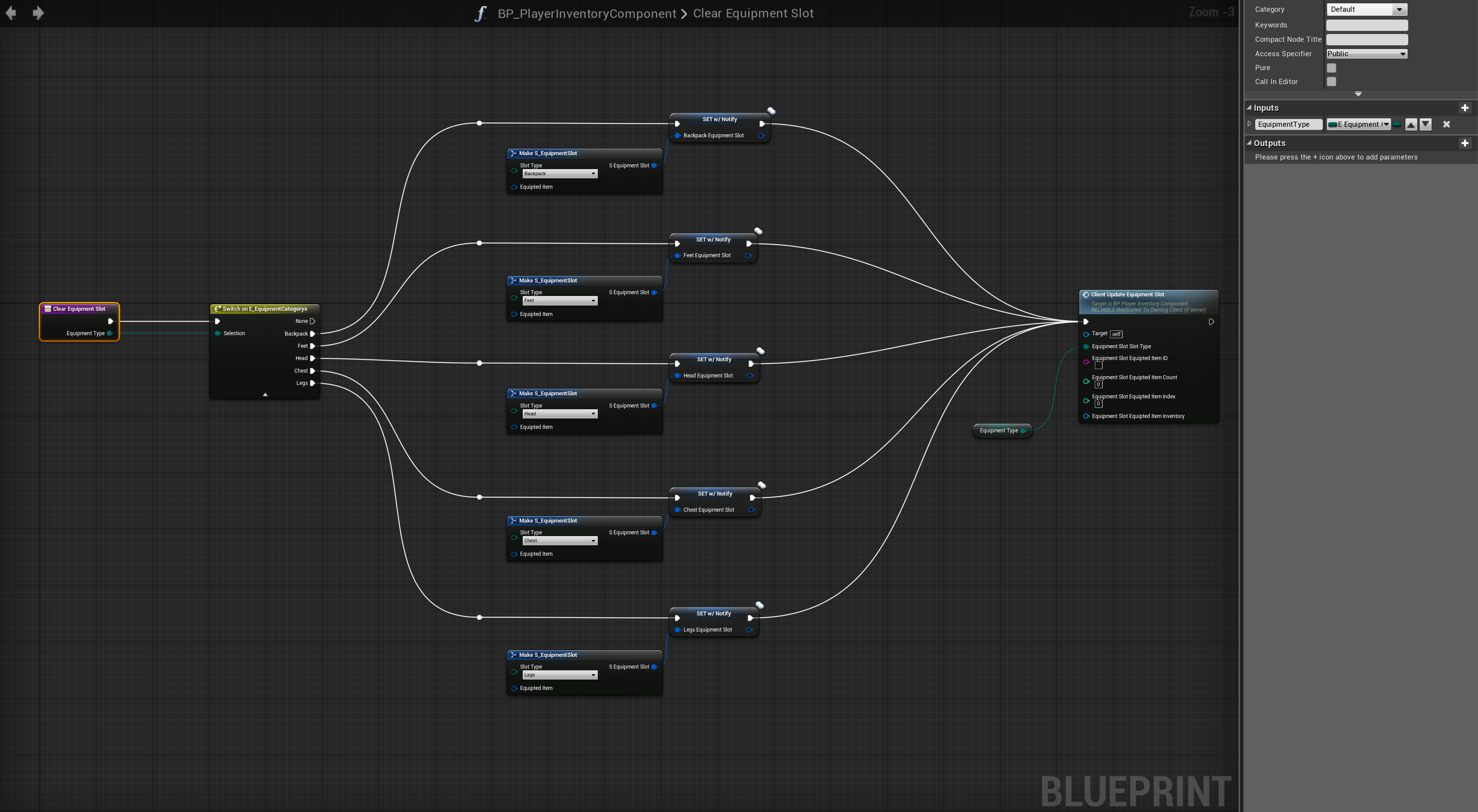 Next create a new function in BP_PlayerInventoryComponent called Clear Equipment Slot and add a input called Equipment Type and set the type to E_EquipmentCategory. Then copy the image below.