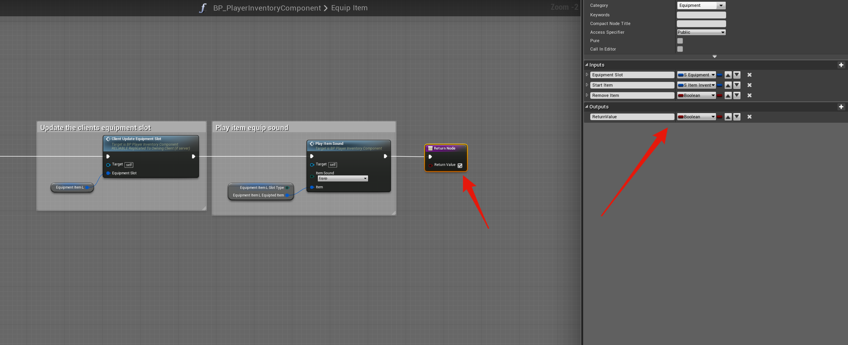 Next go to the Equip Item function in the BP_PlayerInventoryComponent, then add a new output called Return Value and set it to Bool and add the return node like show in the image below.