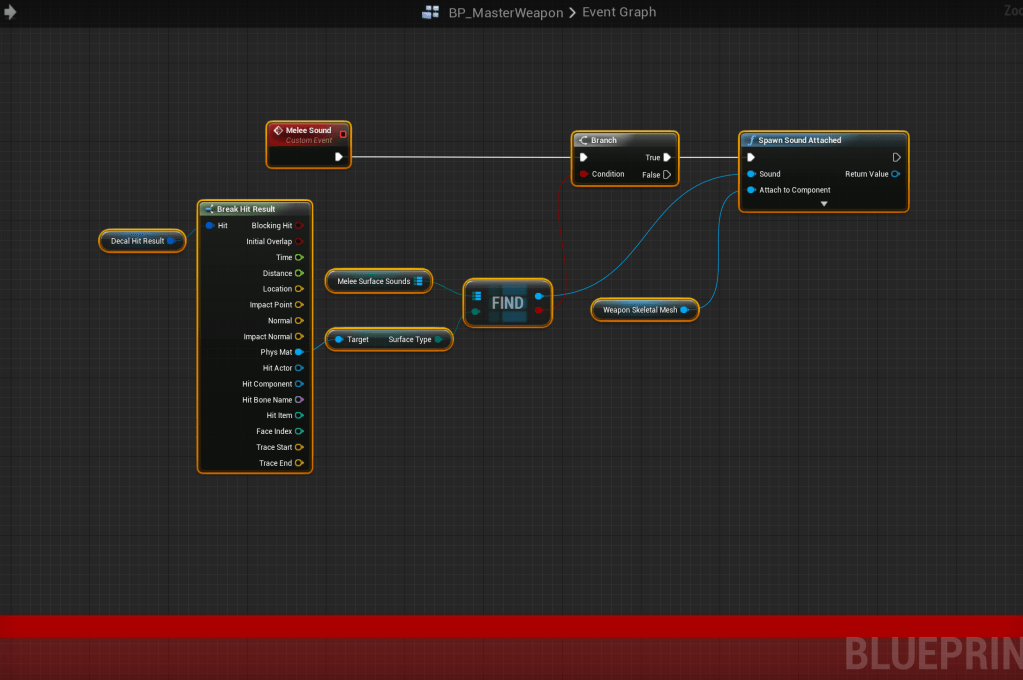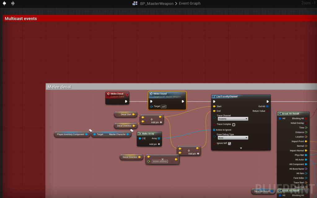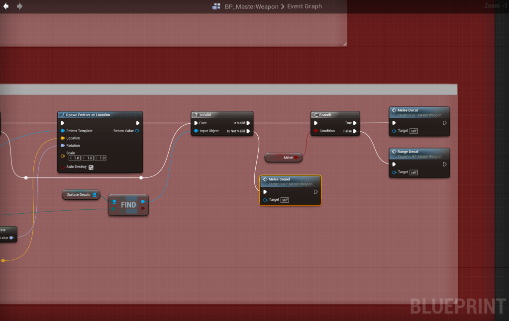 Then go to the BP_MasterMeleeWeapon and then to the Give Damage Once function, in that function are 3 Multicast Spawn Hit Emitter nodes with a Melee input, make sure that on all 3 of these nodes the Melee input is ticked on.
