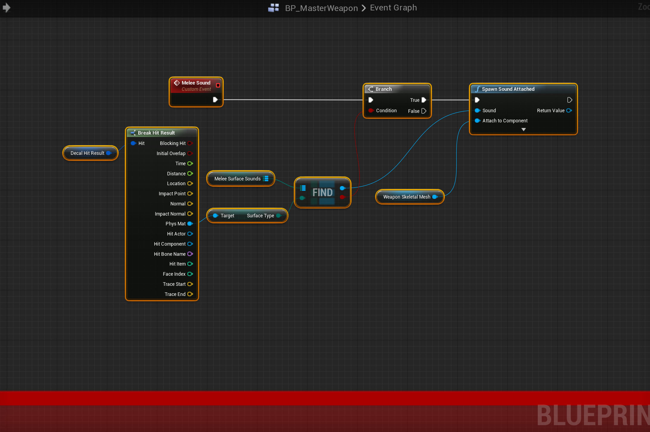 Then go to the BP_MasterMeleeWeapon and then to the Give Damage Once function, in that function are 3 Multicast Spawn Hit Emitter nodes with a Melee input, make sure that on all 3 of these nodes the Melee input is ticked on.