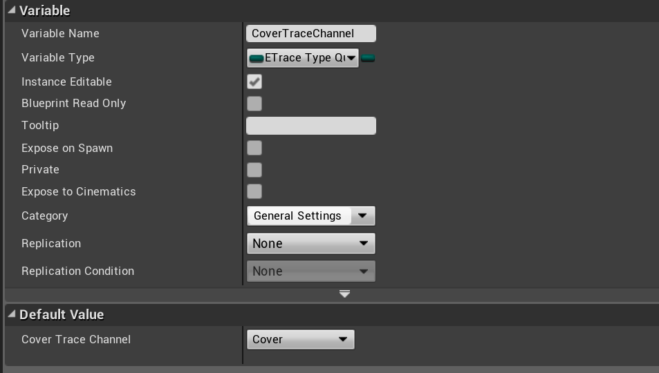 Then create a new variable called CoverTraceChannel and set its variable type to ETraceTypeQuery then set its default value to Cover it should look like the image below.
