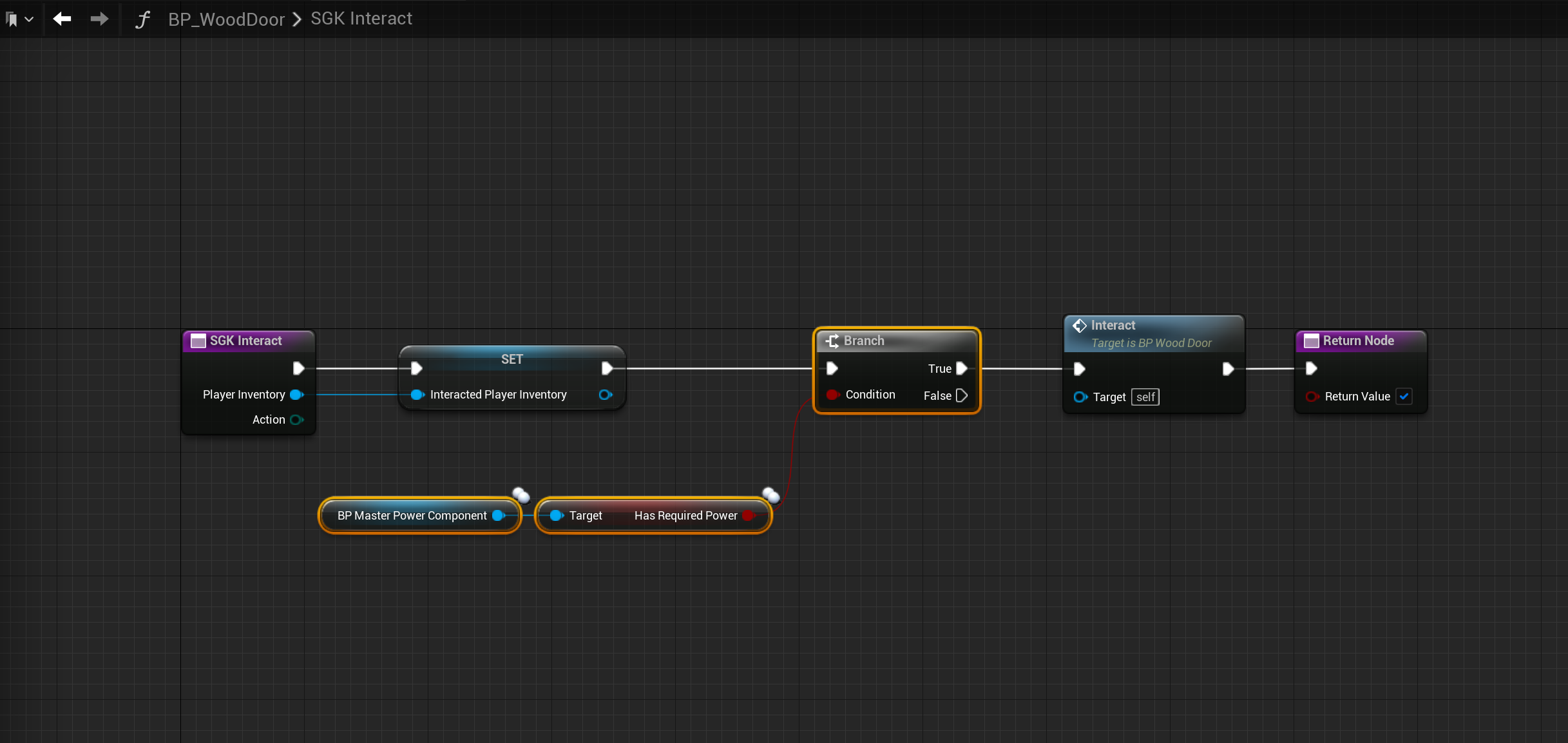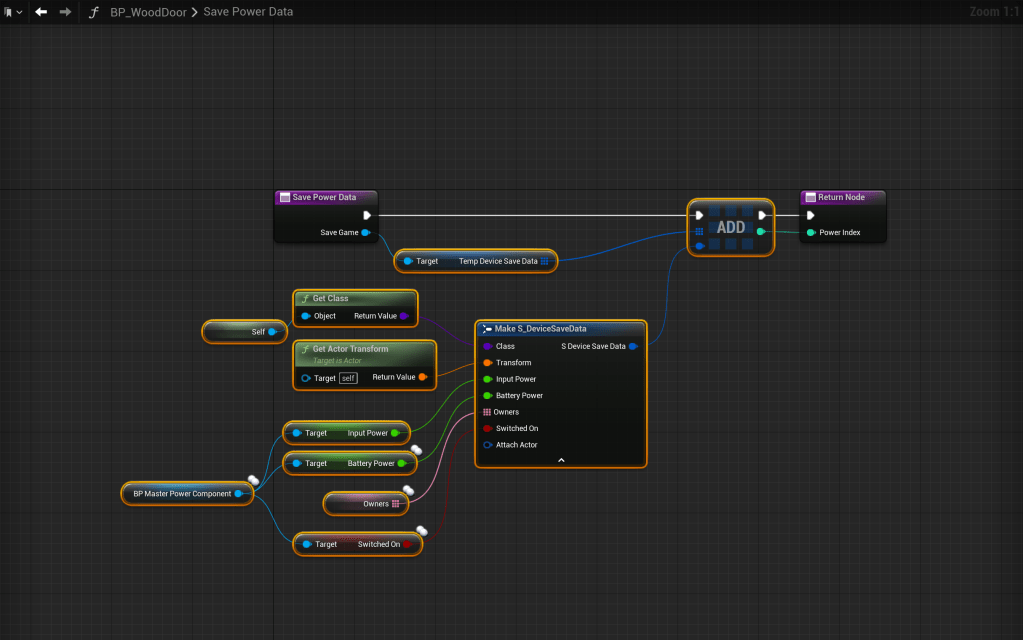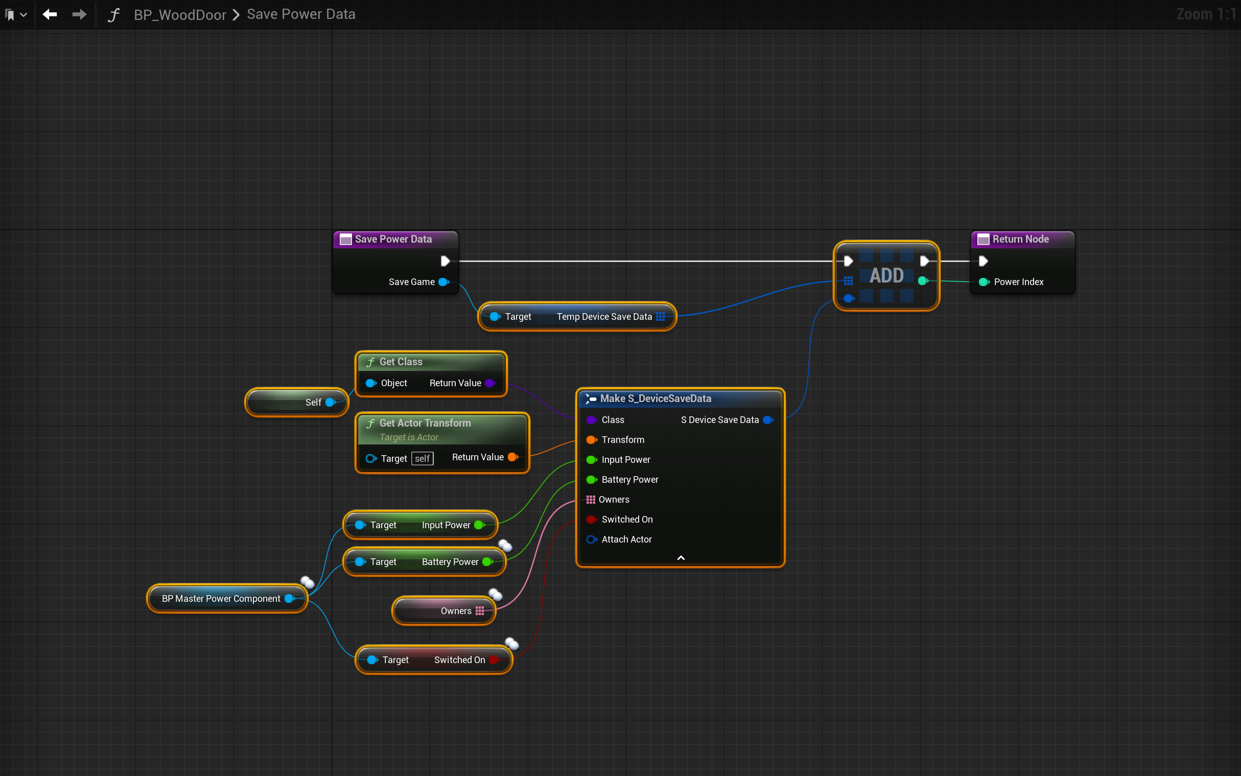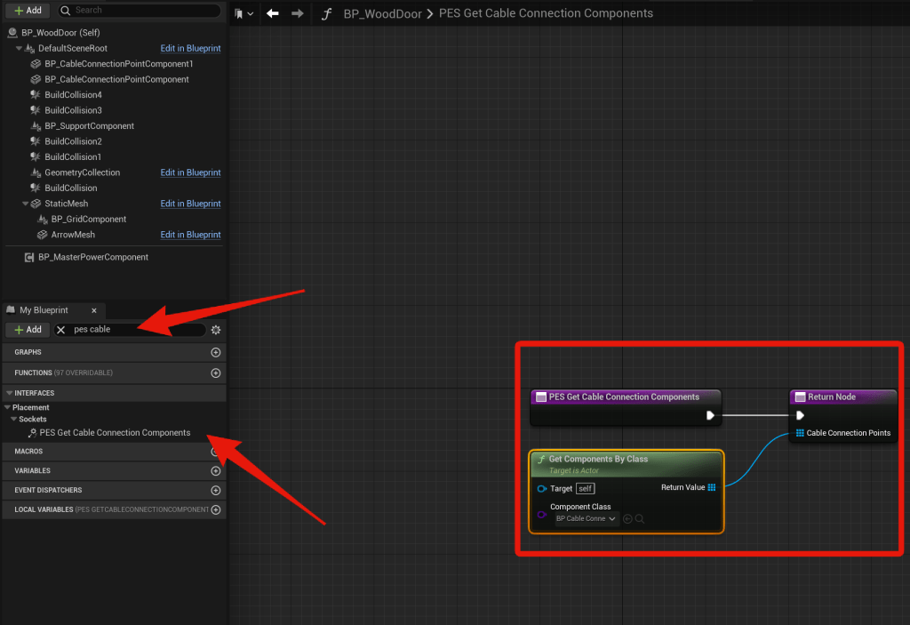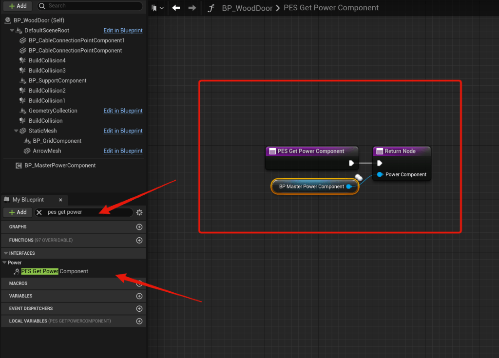 Start by going to the door build part, for this guide I will be using the BP_WoodDoor. Then in the component panel click the Add button and add the BP_MasterPowerComponent.