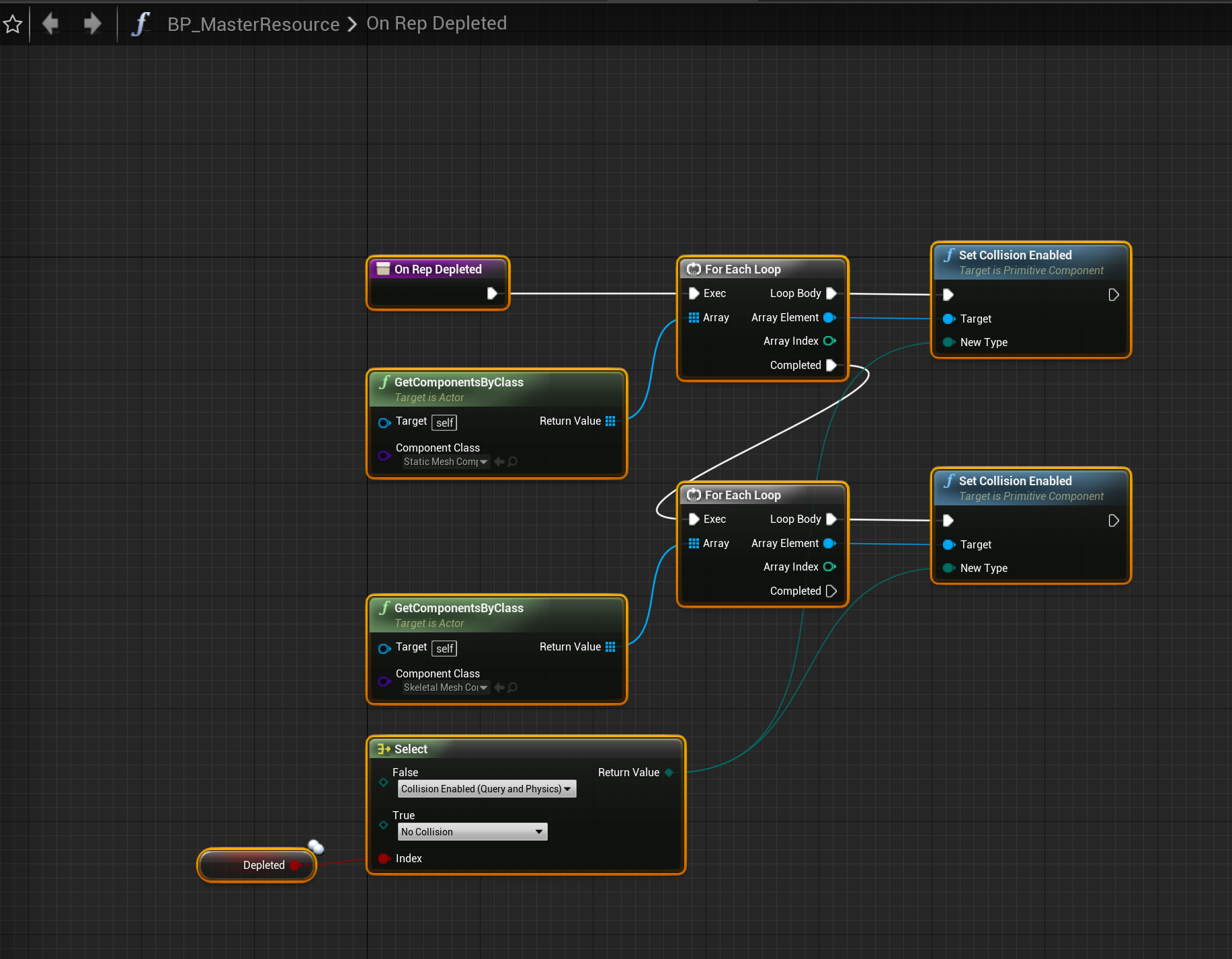Changes to resource destruction collision (UE4) Follow this guide if you are using UE4. Go to the BP_MasterResource and copy the video below. Go to the ResourceSetup function and copy the image below. Go to the OnRep_Depleted function and copy the image below.