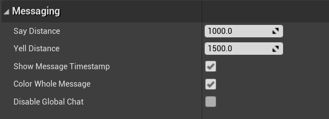 Chat Group Guilds – Say/Yell Distances You can set the Say and Yell message distances in the BP_CGGControllerComponent in the Class Defaults. Search for Distance to find the settings, these values are in CM so 1000 is 10 meters.