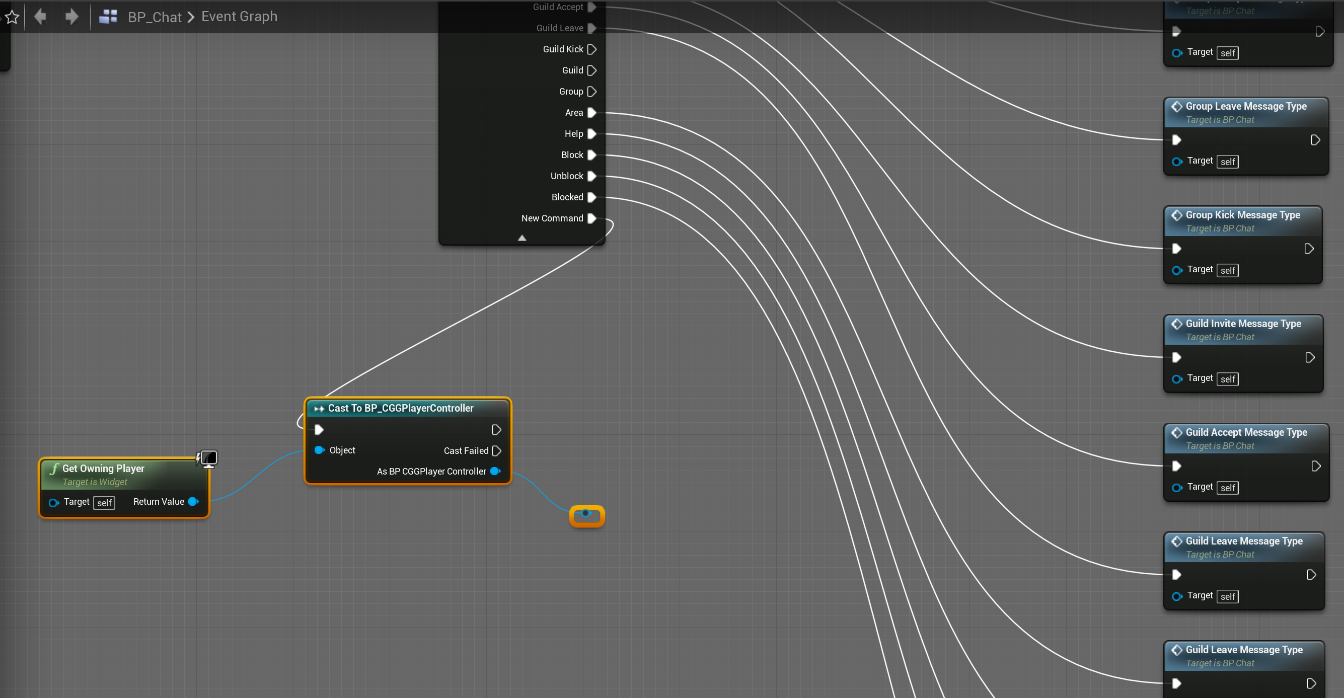 Next go to the BP_Chat widget, in the event graph you will find the switch node with all the message types. Here is where you add the code for your new command. This code will totally depend on what you want your command to do.