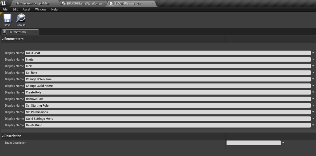 Then go to the BP_CGGGameState and in the class defaults check that in the Starting Roles inside there Permissions arrays none of the entries are set to E_MAX, if any do you will need to set it back to the permission setting it should be. This can happen after renaming an entry on an enum.