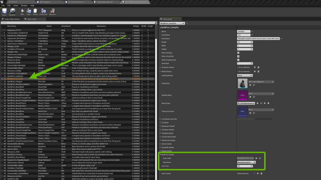 To use the new recipe campfire when the player places a campfire build part go to the ItemList and select the BuildPart_Campfire row and in the Row Editor find the Build Part details and set it like the image below. After doing this all the campfires your player places will be recipe campfires.