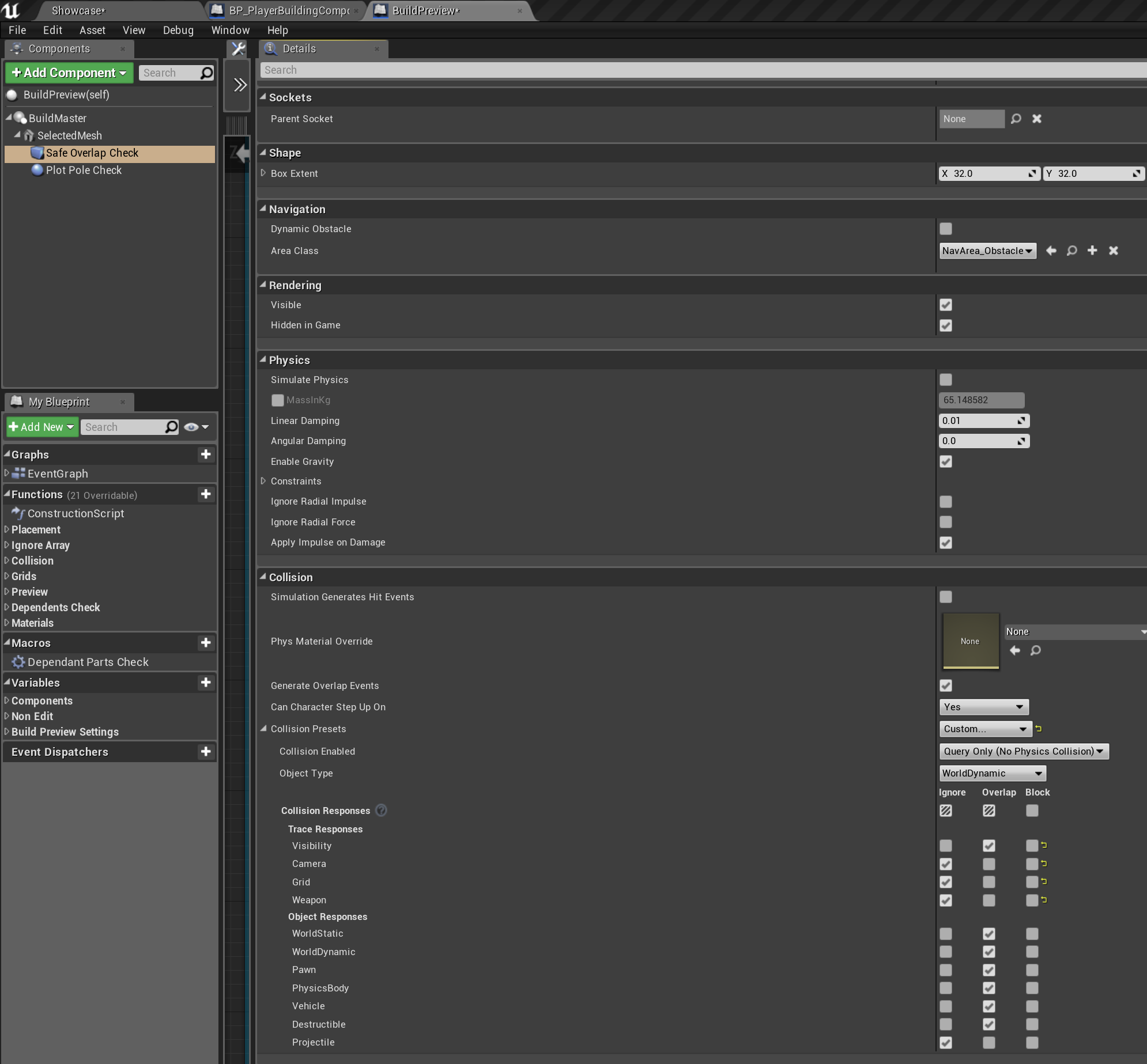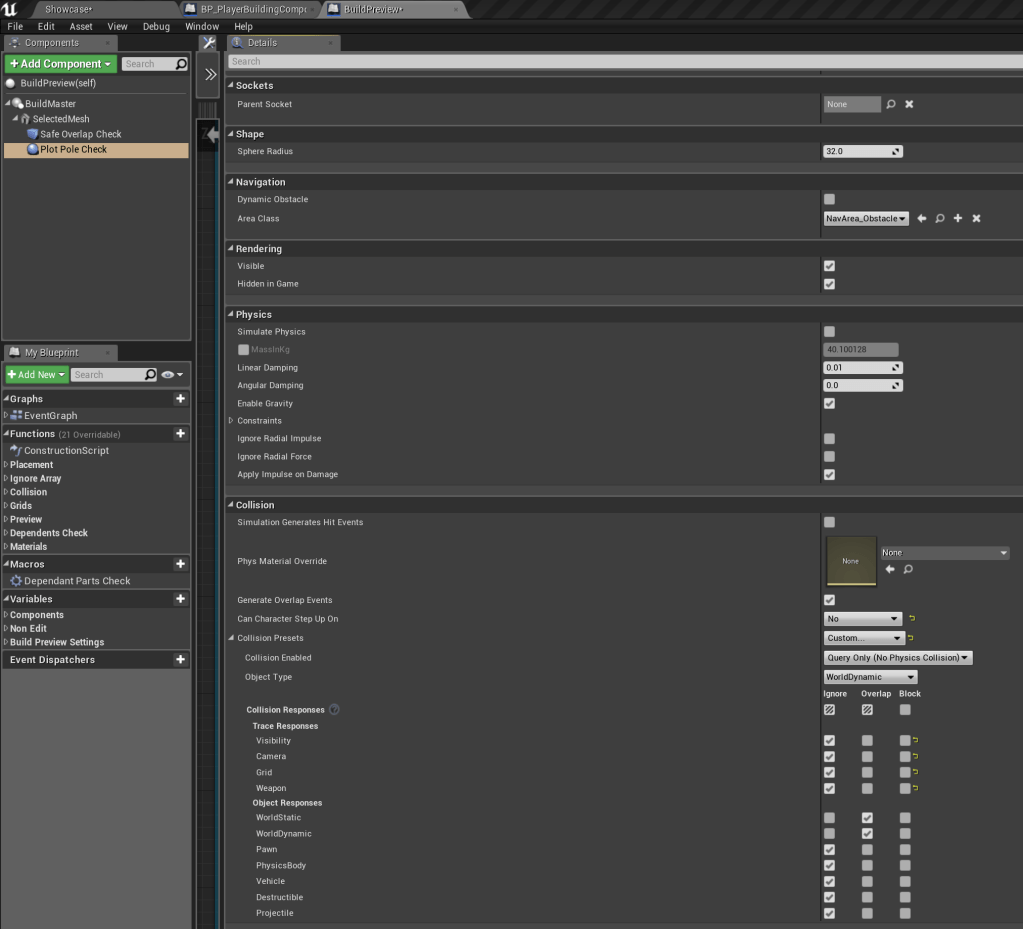 Fixed build preview collision settings You do not need to follow this guide if you have followed the Improvements to build system performance guide. Go to the buildpreview blueprint and select the components shown in the images below and copy the collision settings.