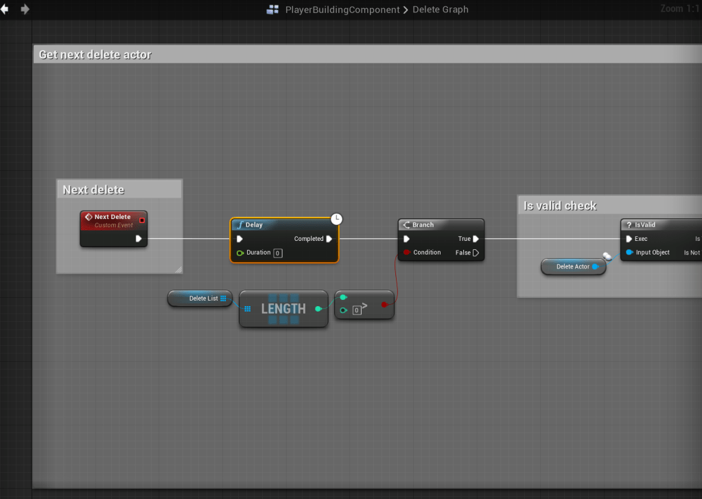 Fixed crash when destroying a large number of build parts Add the node shown in the image, location at the top of the screenshot. Set the duration to 0, this gives a 1 frame delay.