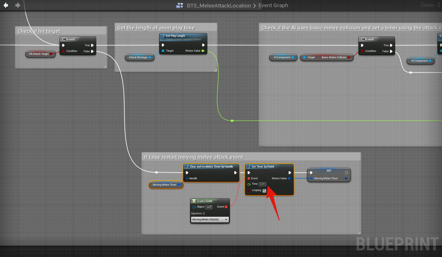 Fixed delay before melee attacking Add the highlighted nodes shown in the images below, locations at the tops of the screenshots.