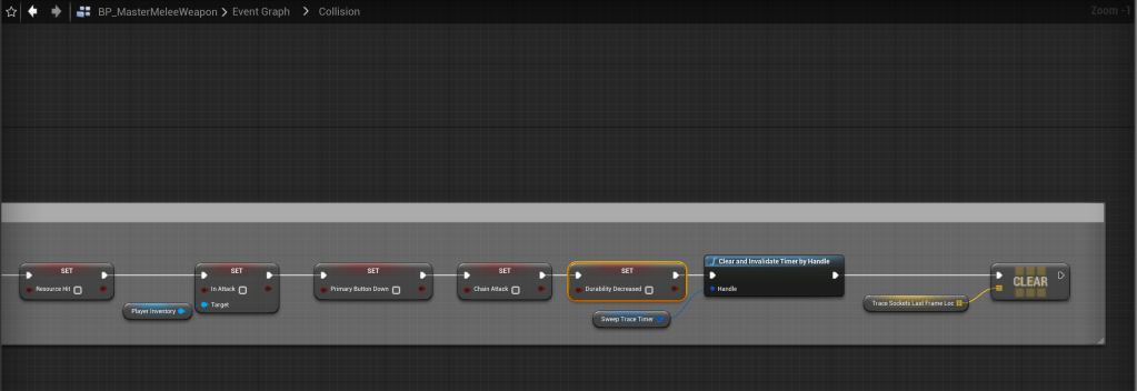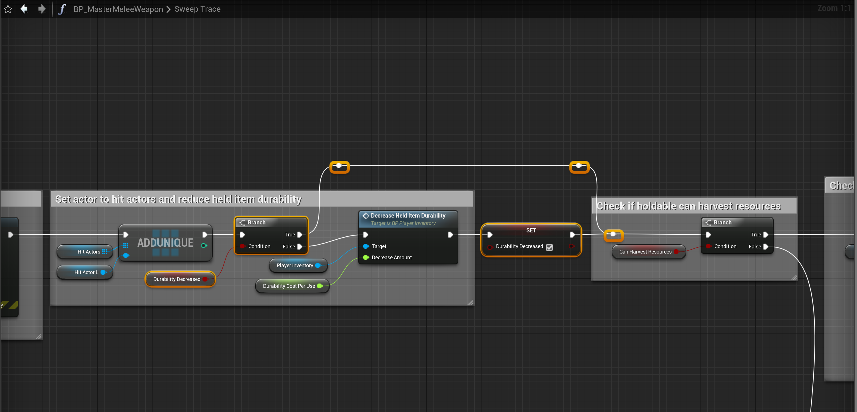 SGK V2 – Fixed double durability decrease for hitting resources Go to the SweepTrace function in the BP_MasterMeleeWeapon and create a new Variable called DurabilityDecreased and set it to a Boolean. Then copy the images below.