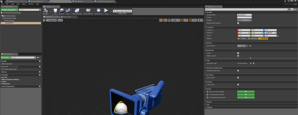 Go to the the BP_MasterAttachment and create a new Scene component called MuzzleEffect then set its Z rotation to 90. It should look like the image below.