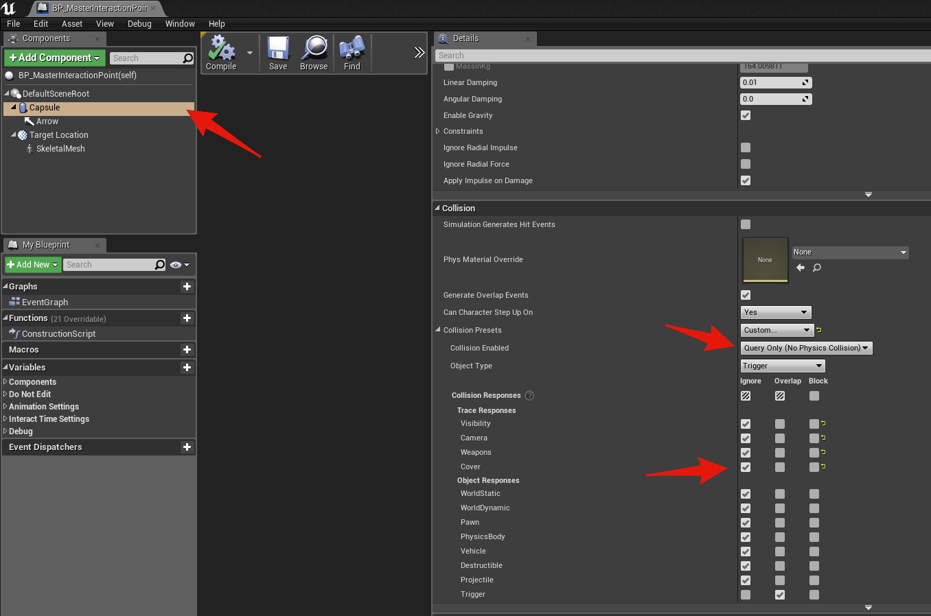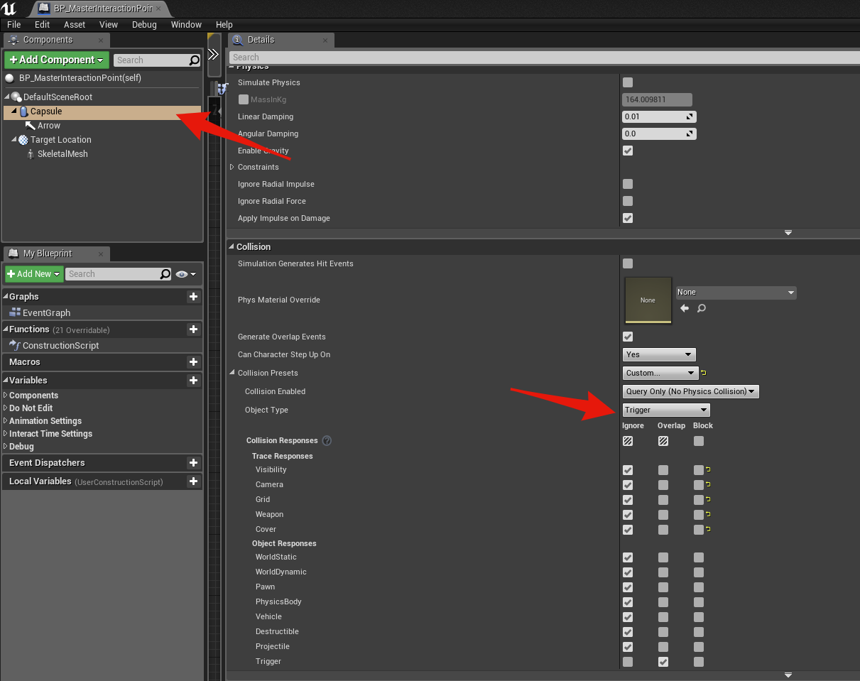 Go to the BP_MasterInteractionPoint and select the Capsule component then copy the collision settings shown in the image below.