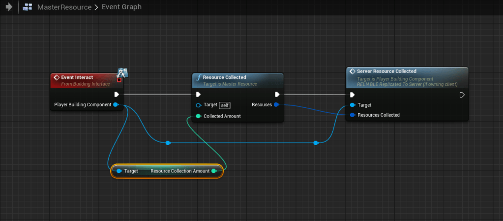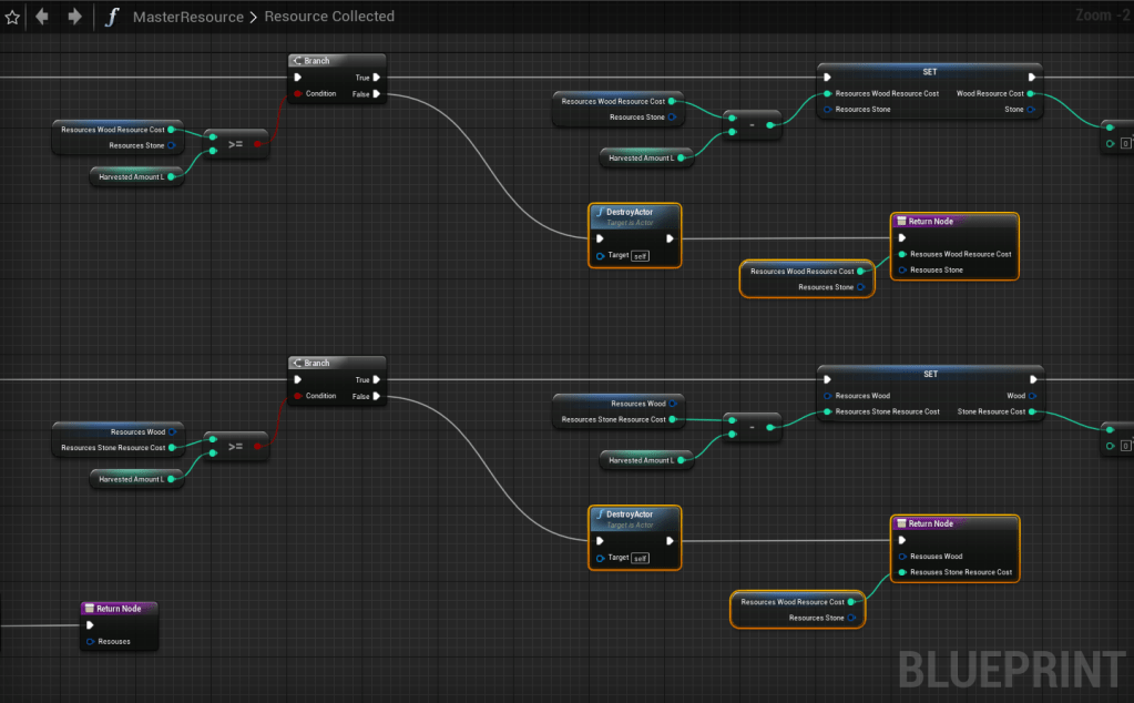 Next go to the location shown below and make you code look like the image below. You just need to connect the false pins from the branch nodes to the Destroy Actor nodes and copy the Resource Wood variable from any of the ones already in the function paste it near the return nodes and connect the green pin to the return nodes.