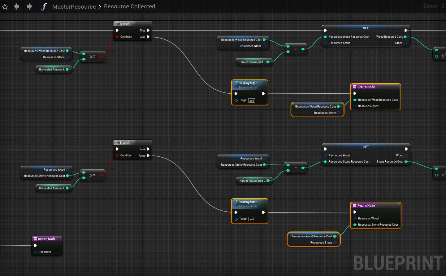Next go to the location shown below and make you code look like the image below. You just need to connect the false pins from the branch nodes to the Destroy Actor nodes and copy the Resource Wood variable from any of the ones already in the function paste it near the return nodes and connect the green pin to the return nodes.