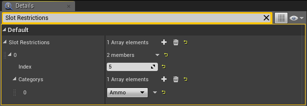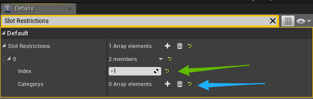 The index is the slot that you are applying this restriction to so for example if you want the players first quick slot to only allow consumables you would set the Index to 0 as the slots start at 0 not 1. Then you would click the + button next to the categorys to add a new item category like below.