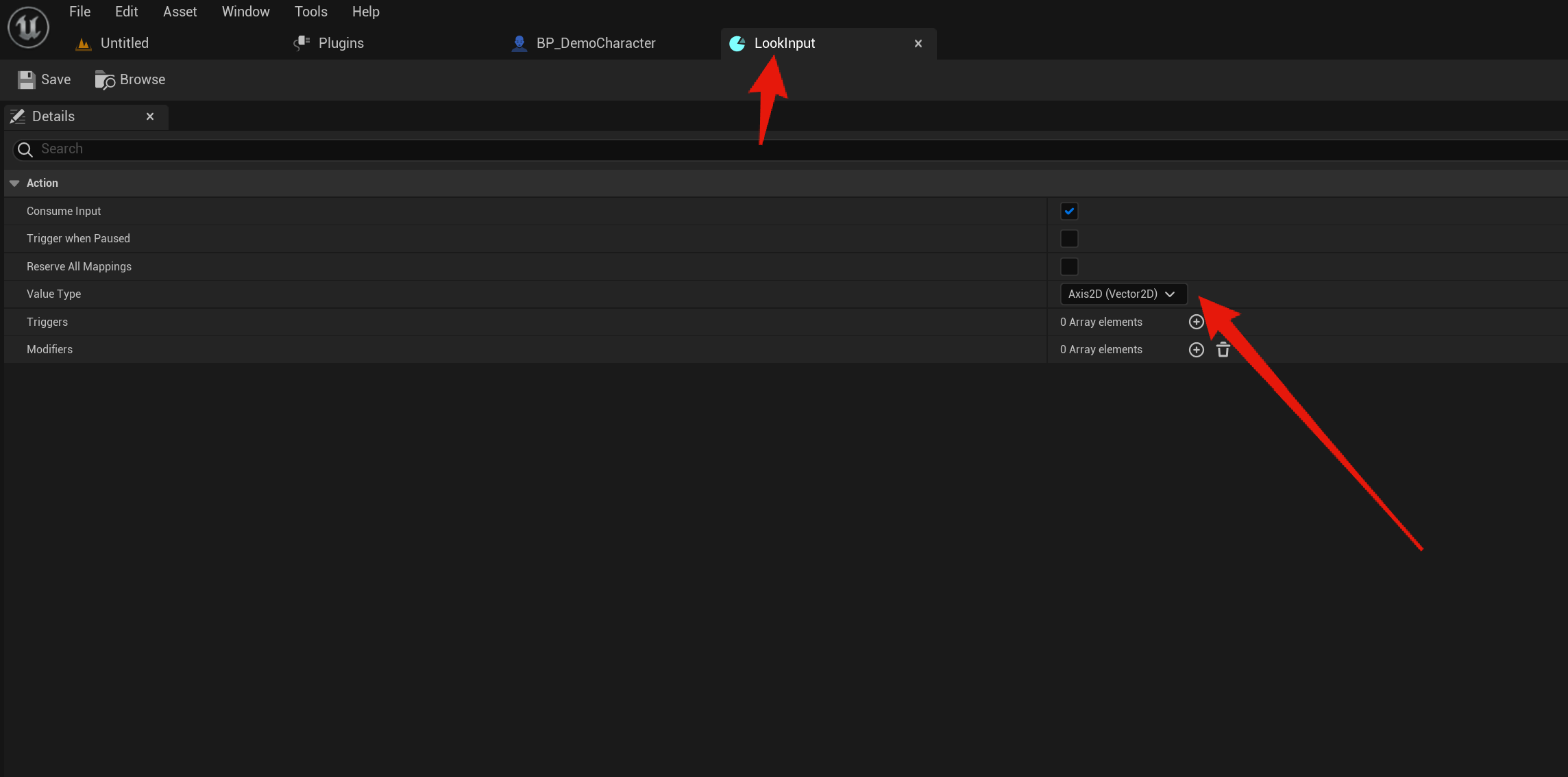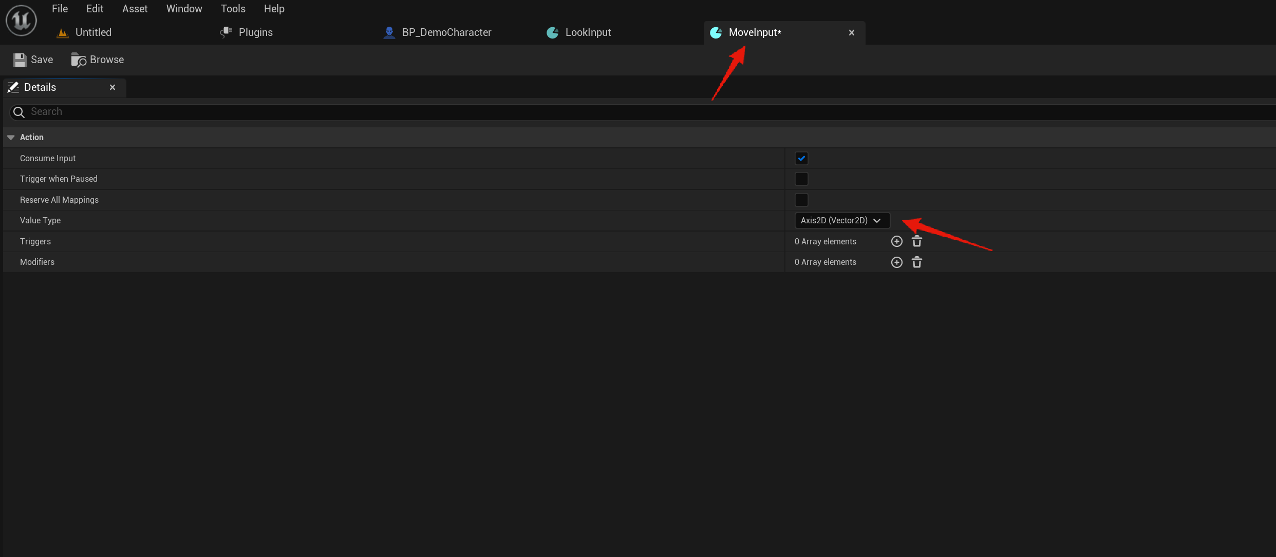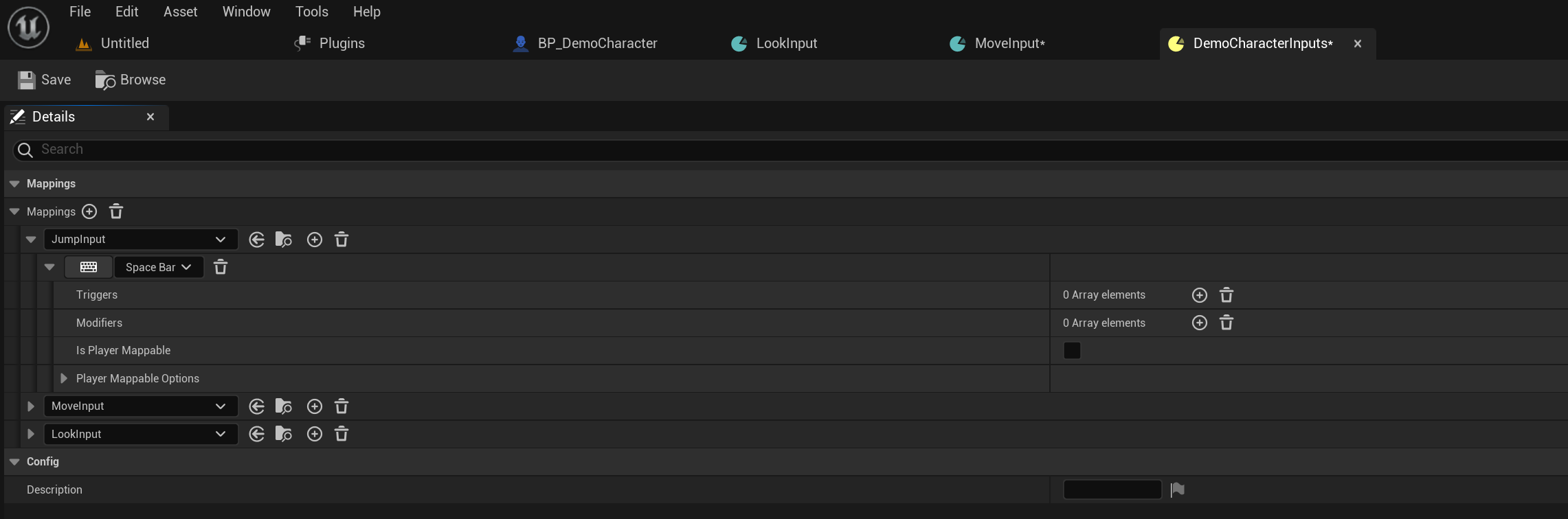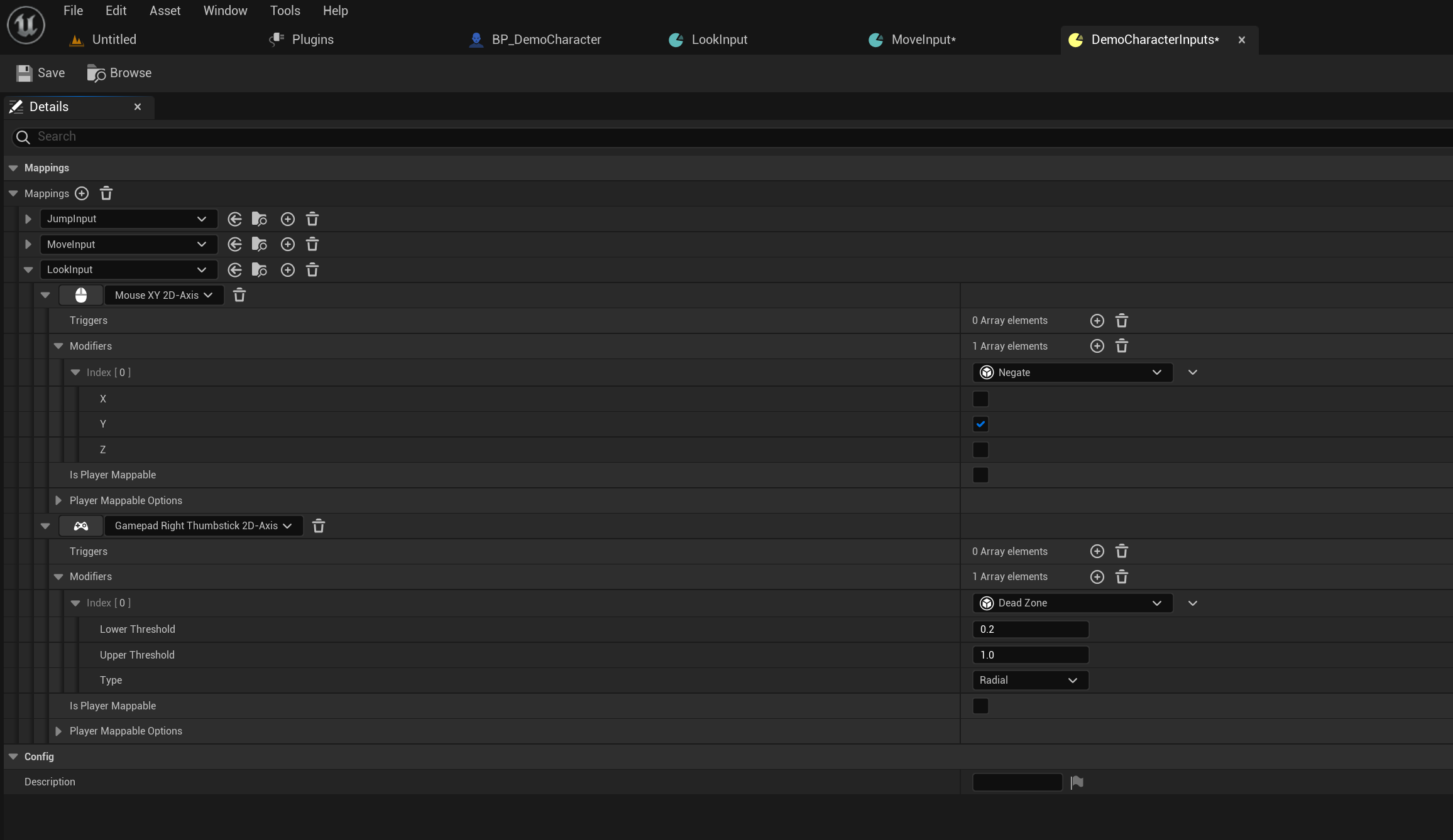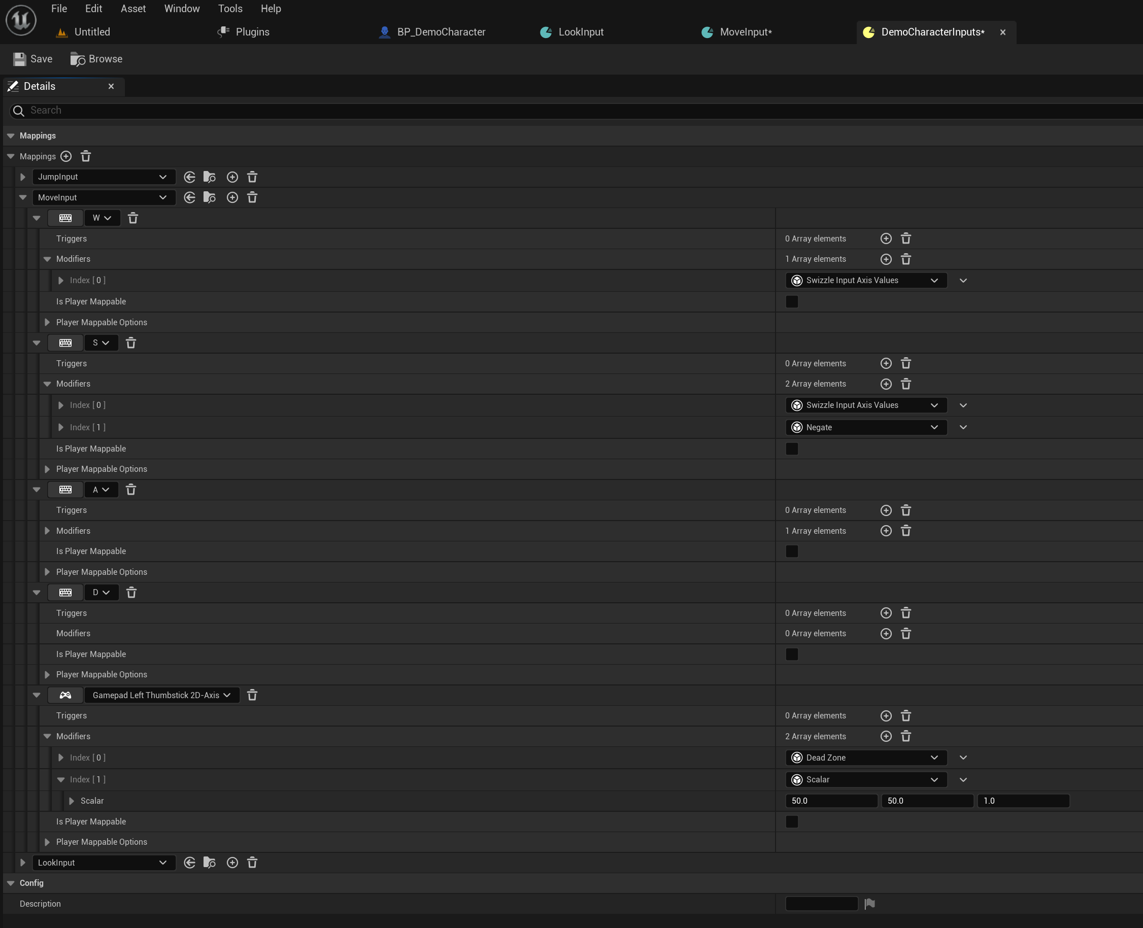 Next go to the DemoCharacterInputs and copy the images below, click the + button next to the Mappings text to add new input actions. Then go though each action input and add the key inputs and their modifiers, make sure you copy the modifier settings as well.