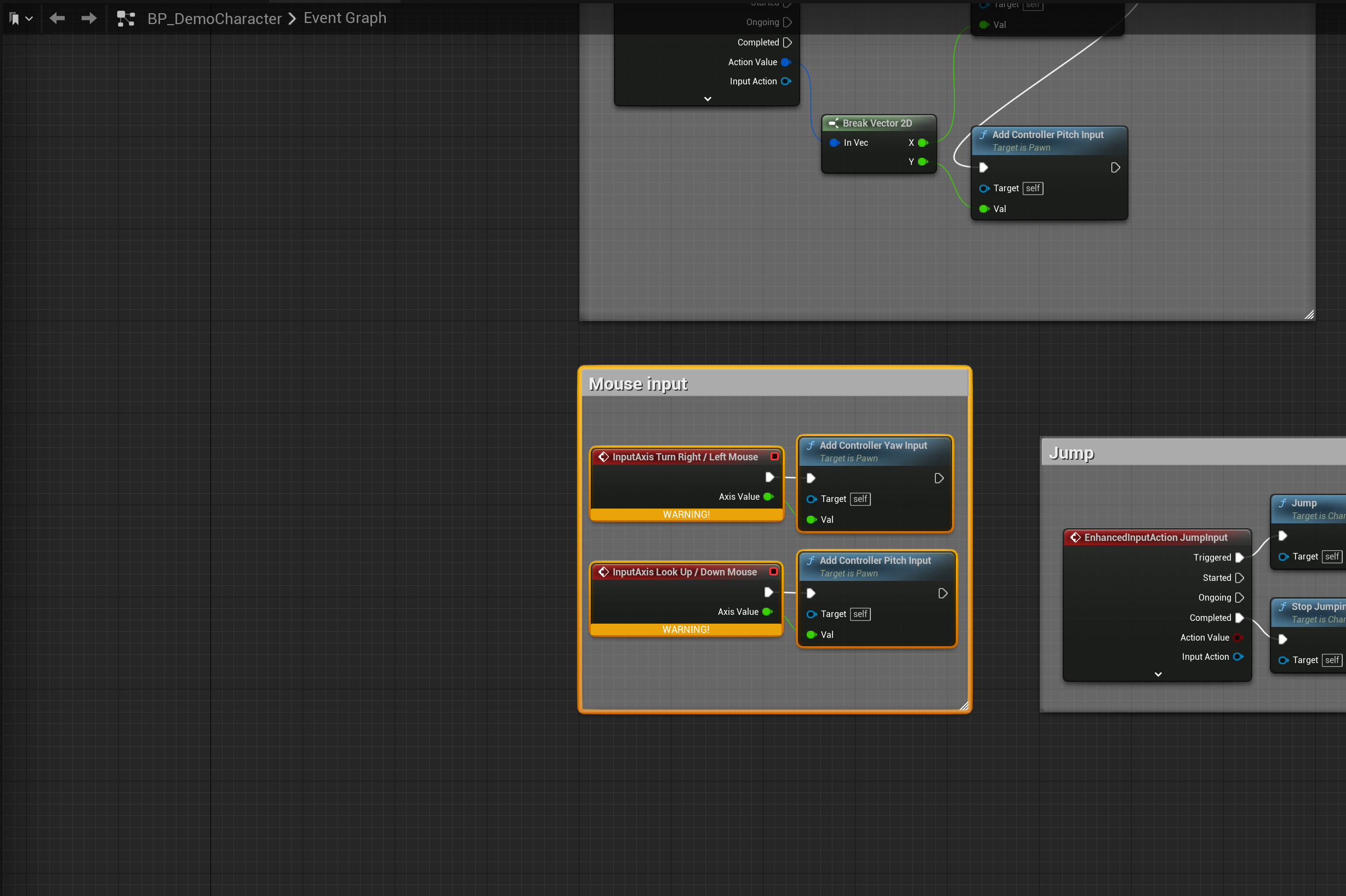 Next go to the BP_DemoCharacter and copy the image below make sure you have the same highlighted nodes.