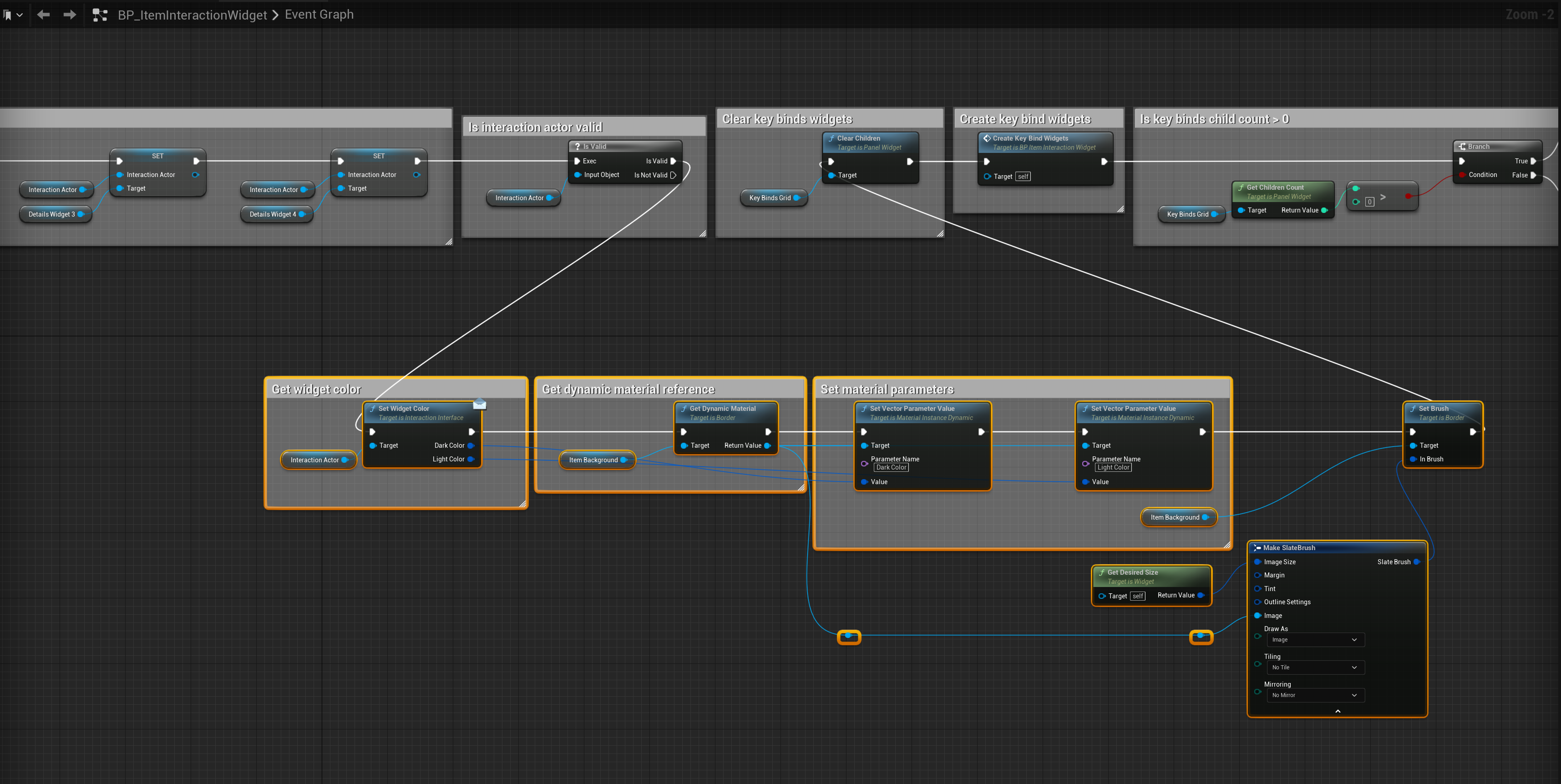 Interaction Widgets – Fixed packaged game crash caused by Get Dynamic Material node Copy the video below in the BP_ItemInteractionWidget Add the highlighted nodes shown in the image below, location at the top of the image.