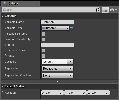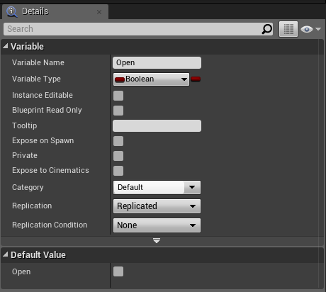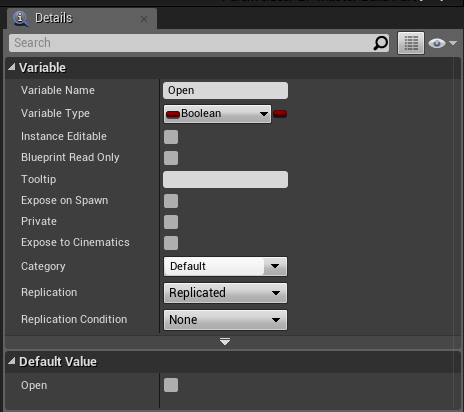 Next go to the OpenableDoor blueprint and create 2 new variables and set them like the 2 images below. Make sure you set Replication to Replicated.