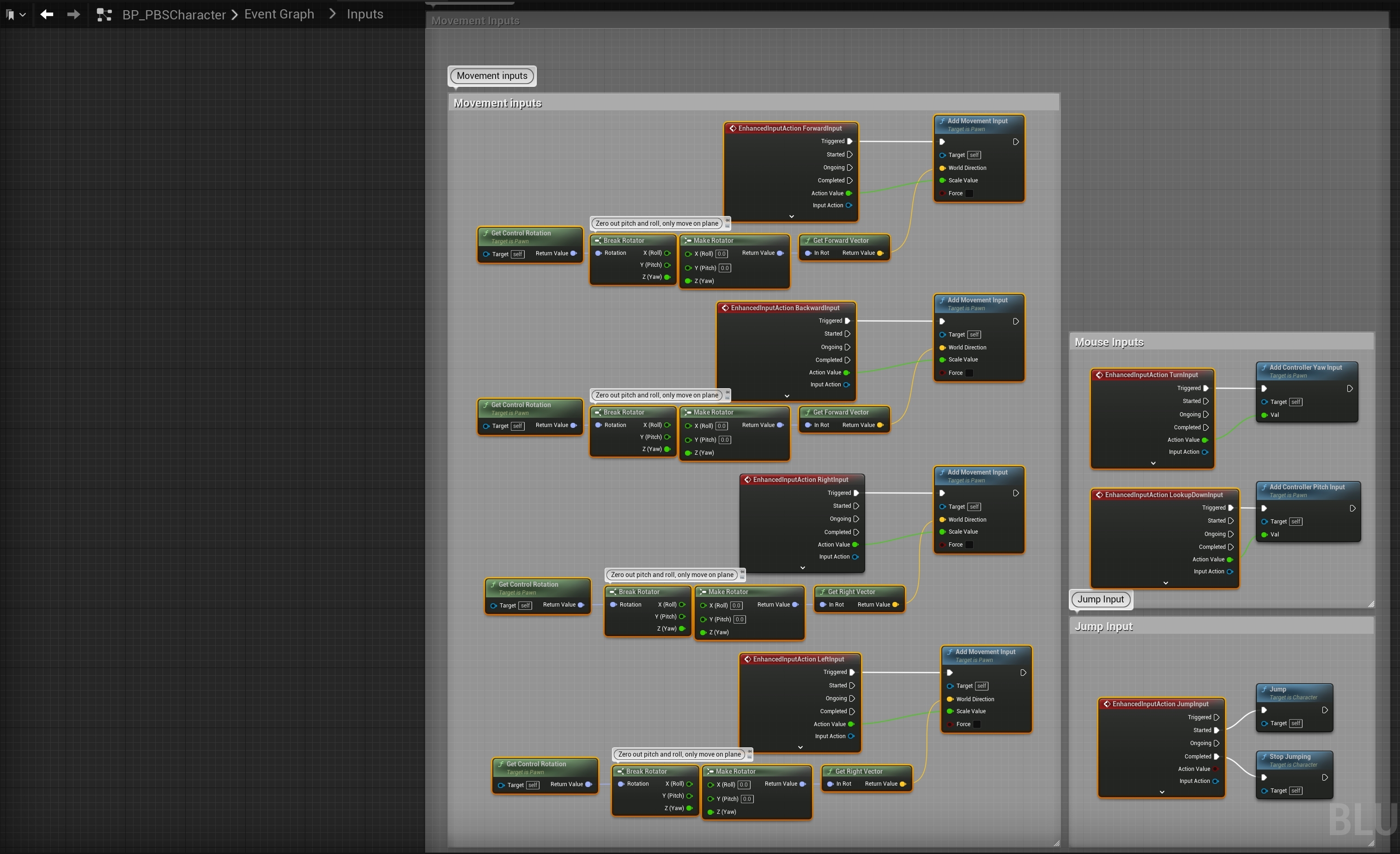 Now you can reopen the project and go to the BP_PBSCharacter you will now need to replace the old input events with the new enhanced input events like shown in the images below. You can find the by right clicking and searching for the name shown on the nodes in the images.