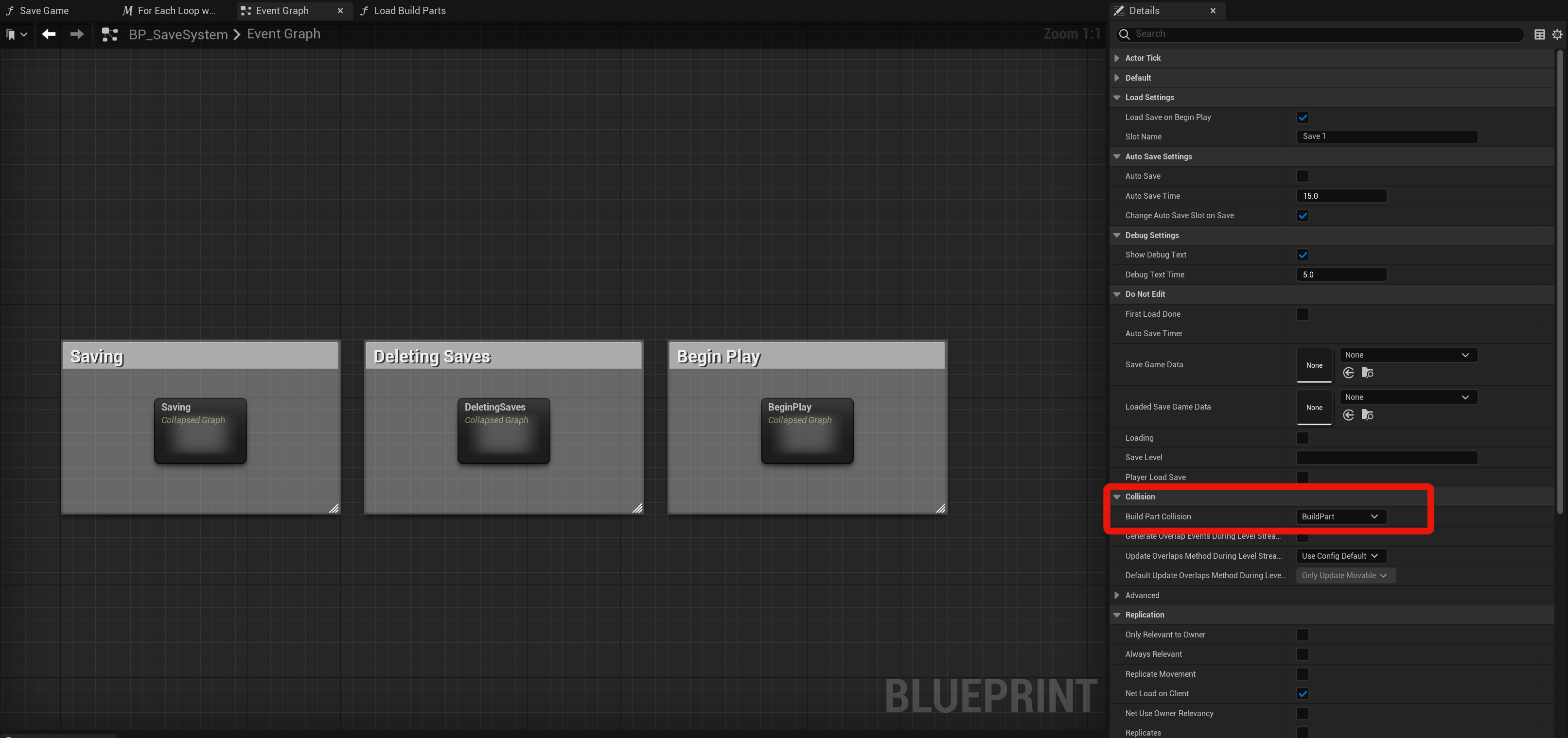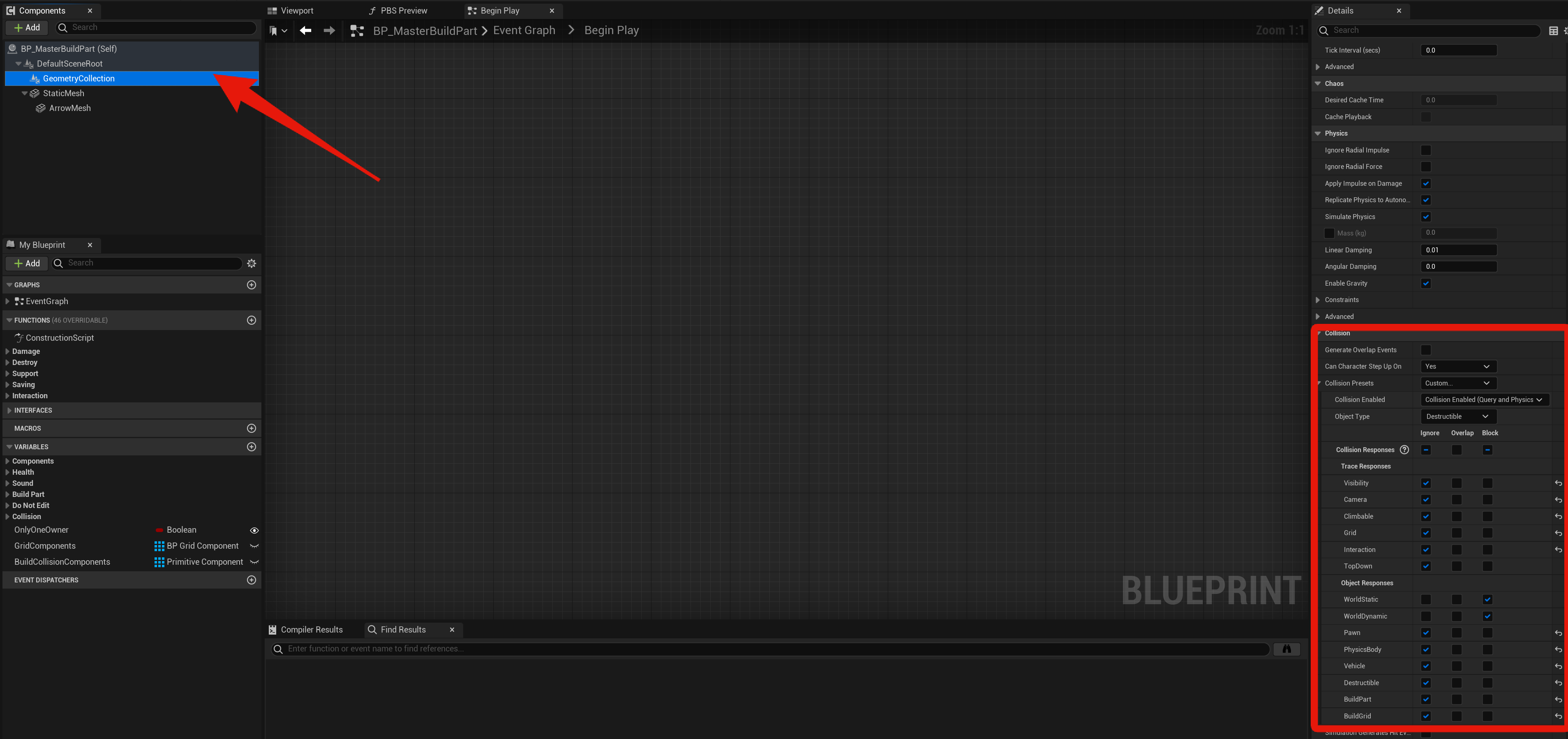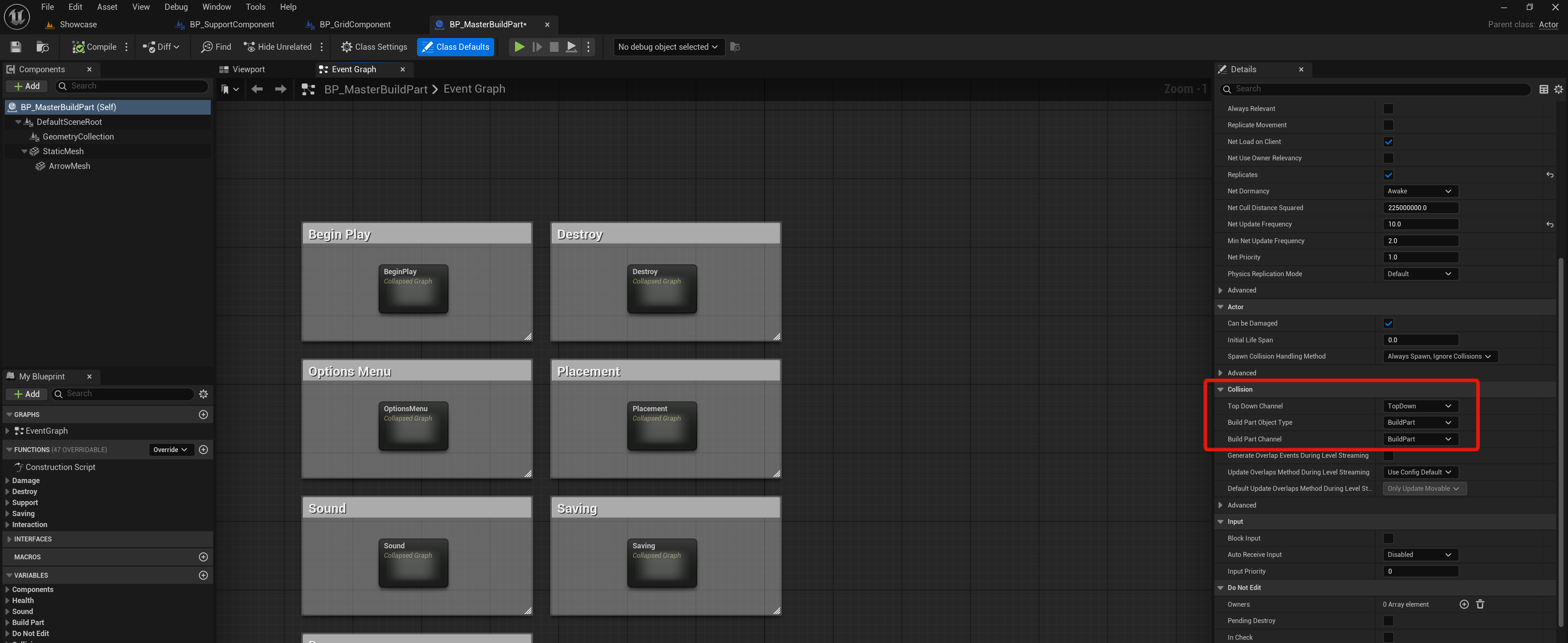 Next go to the BP_MasterBuildPart and select the Class Defaults button and search for collision, here you will see the same settings as the image below, make sure all the options in the red box are the same in your settings.