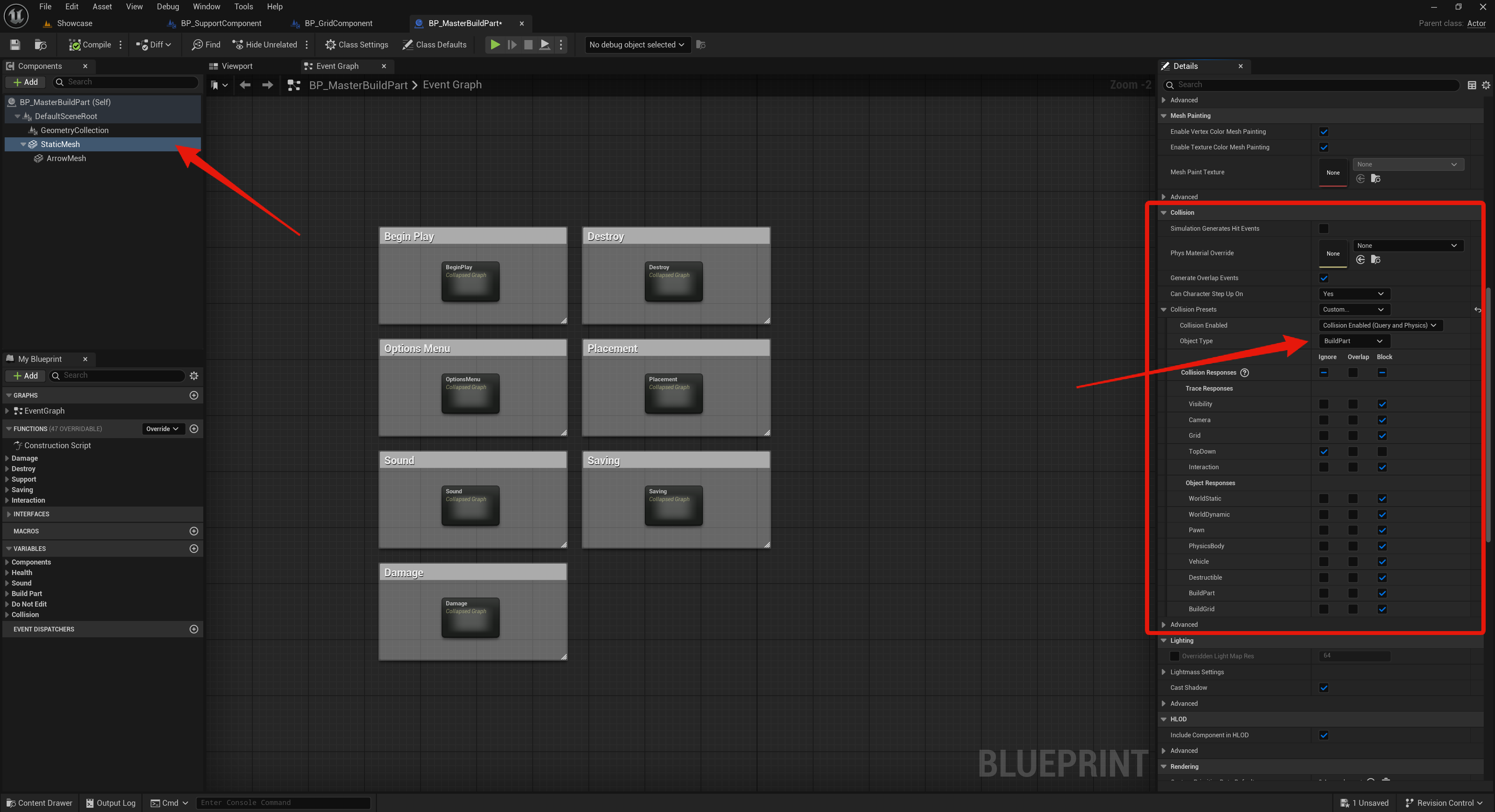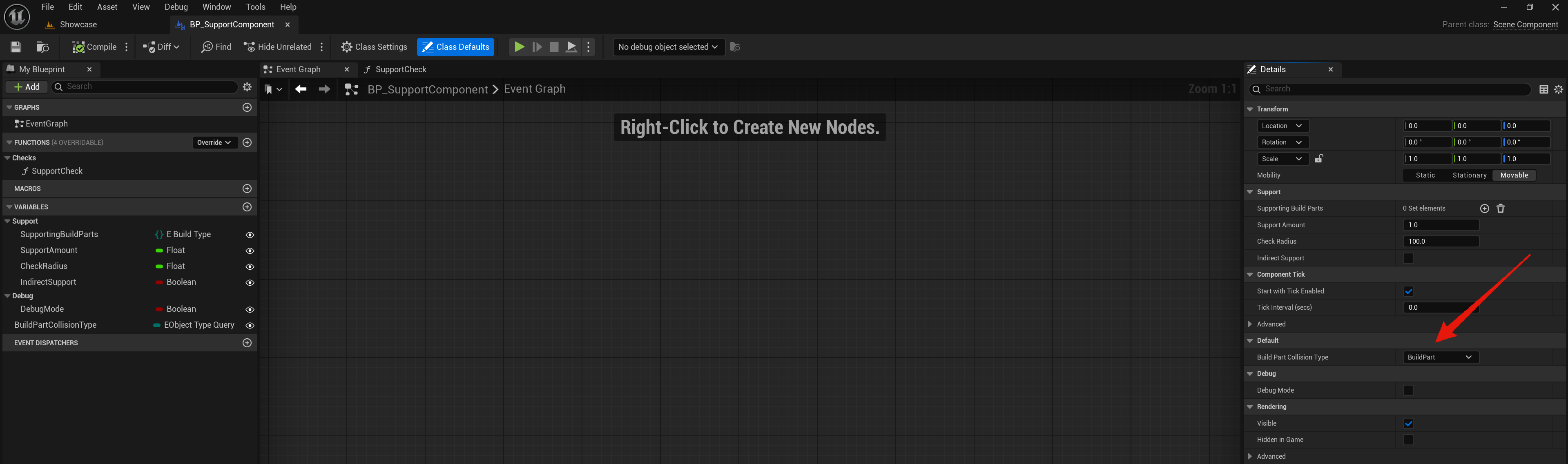 Next go to the BP_SupportComponent and select the Class Defaults button and search for collision, here you will see the same settings as the image below, make sure all the options shown in the images below are the same in your settings.