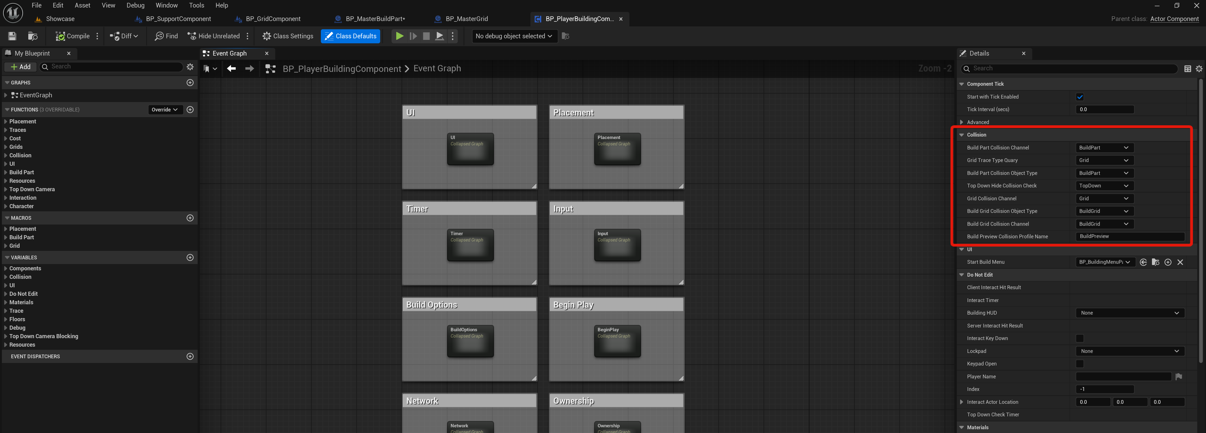 Next go to the BP_PlayerBuildingComponent and select the Class Defaults button and search for collision, here you will see the same settings as the image below, make sure all the options in the red box are the same in your settings.