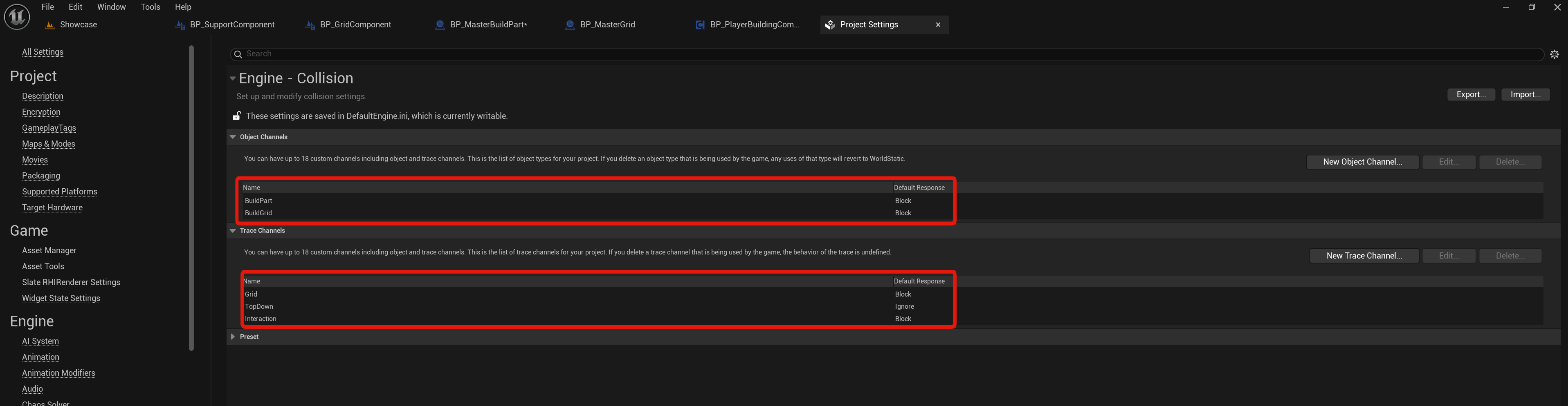 If you migrated Player Building System V2 into another project or if you’ve made modifications to the collision settings you may be missing or have an incorrect collision setting. You may already have some settings set correctly but other might not be so its worth quickly going though and checking all these settings if you are having issues with the building.