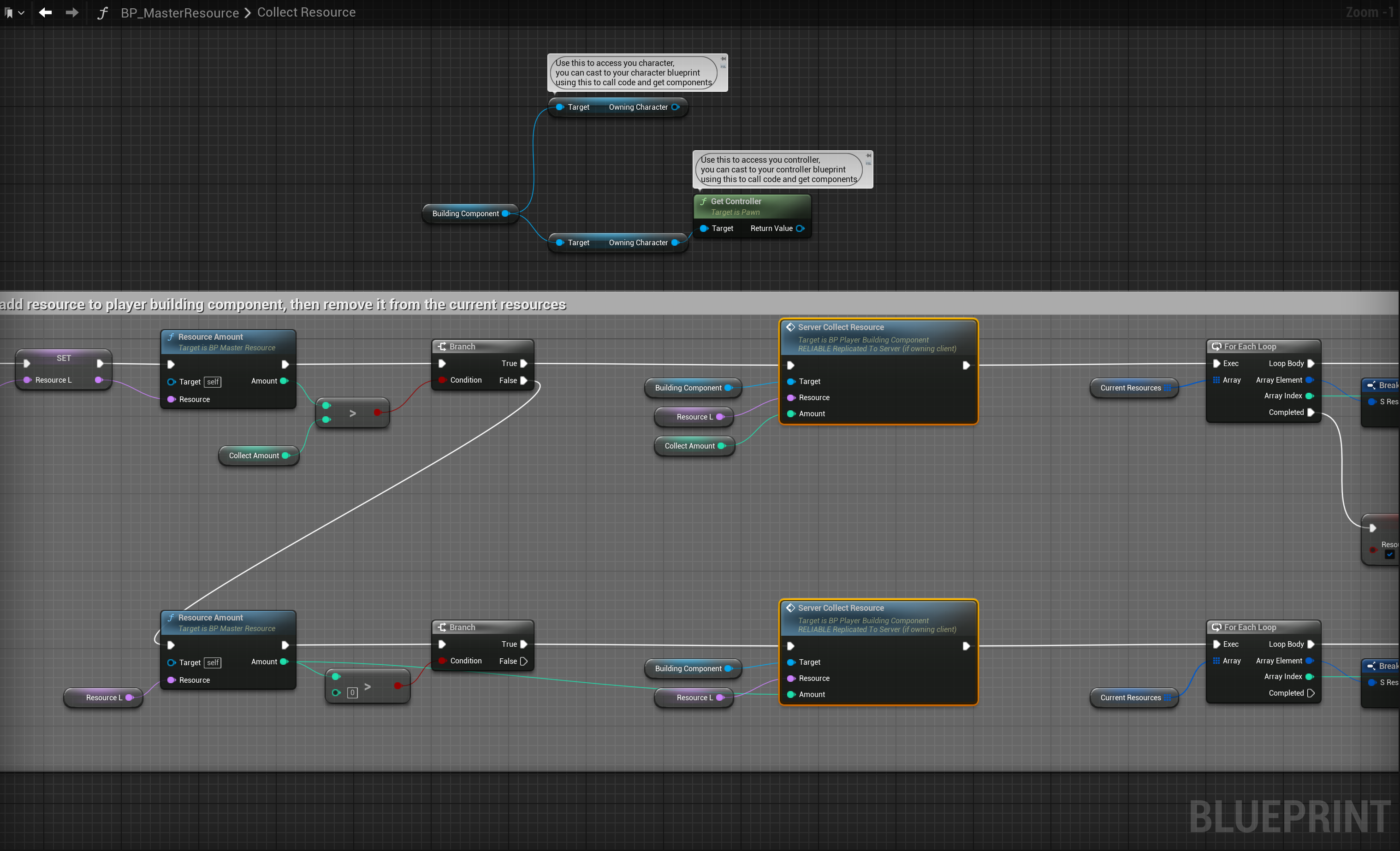 The function below is the Collect Resource function in the BP_MasterResource blueprint, its where the code is that increase the player resources when they interact with a resource.