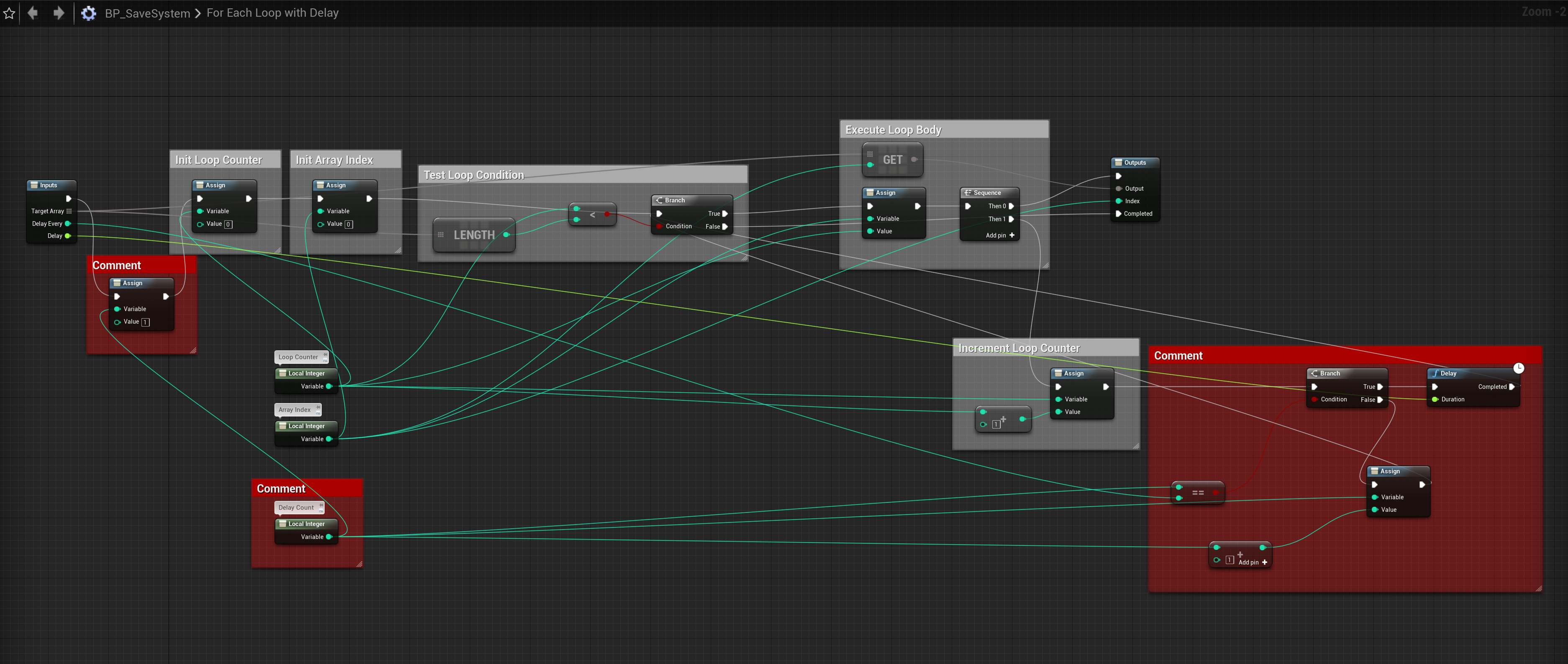 Once you finish following the videos the macro should look like this. I’ve highlighted the nodes added to the nodes we copy and pasted from the default ForEachLoop node.