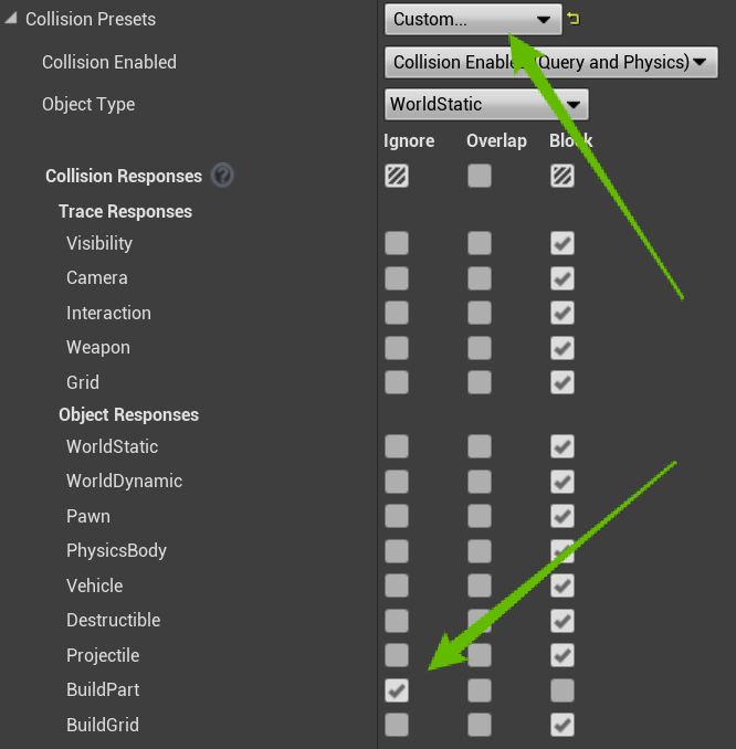 This process will depend on the actors type and if it has multiple component thats are blocking the collision. The best way to fix this is go to open the blueprint that is causing the issue and go though each component and If it has collision settings (not all components do) make sure its set to ignore Build Part.