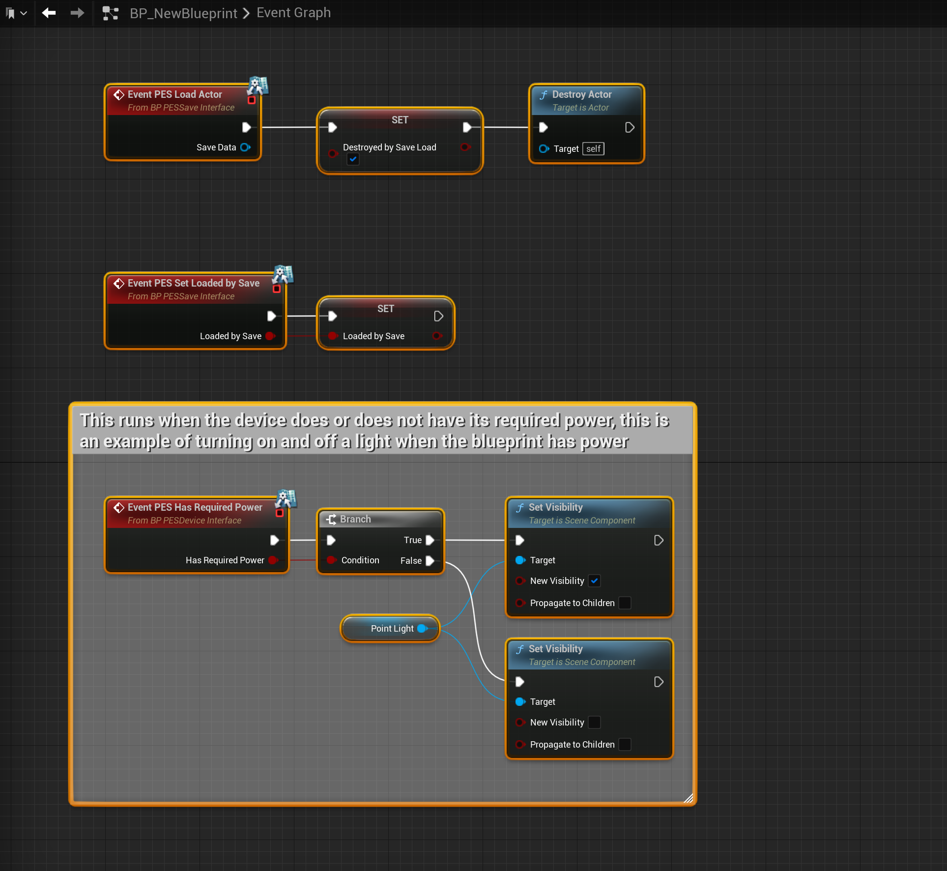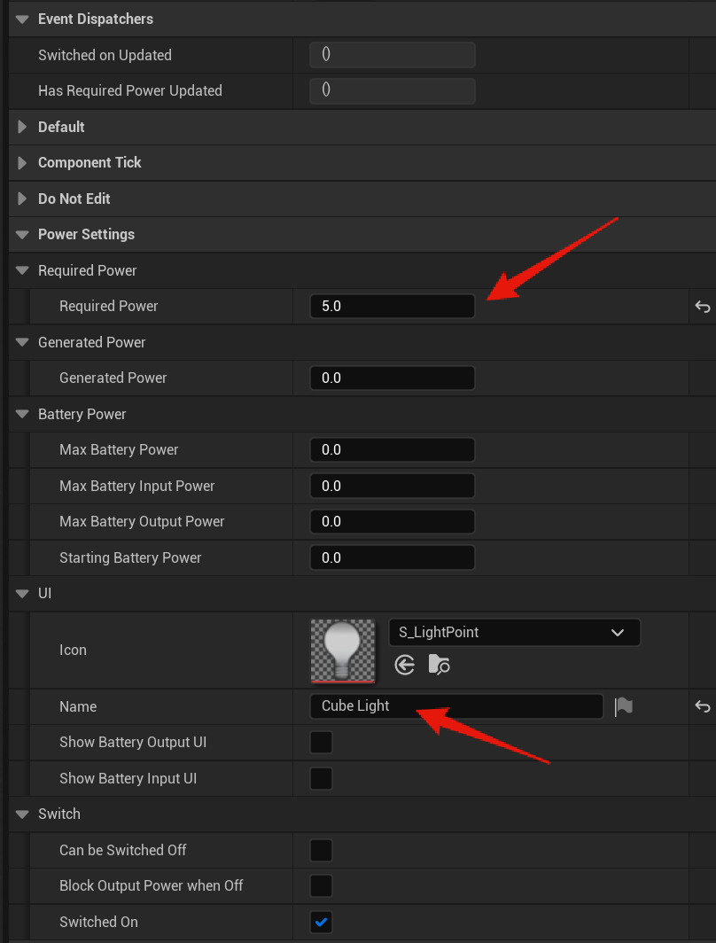 The PES Has Required Power event is run whenever the device does or does not have its required power, this can be used to run whatever code you need you blueprint to run when power is or isnt provided to it. The example in the image above turns on and off a light, the Point Light component also has its Visible setting turned off in its components settings so it starts off.