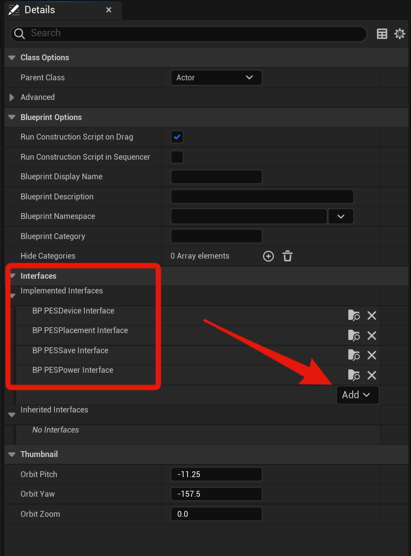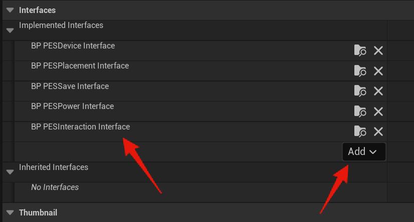 Then click the Class Settings and add the Interface blueprints shown in the image below, to add a new interface click the Add button and search for the interface name. Depending on your engine version the Add button may be under the Inherited Interfaces section, if it is then use that Add button.