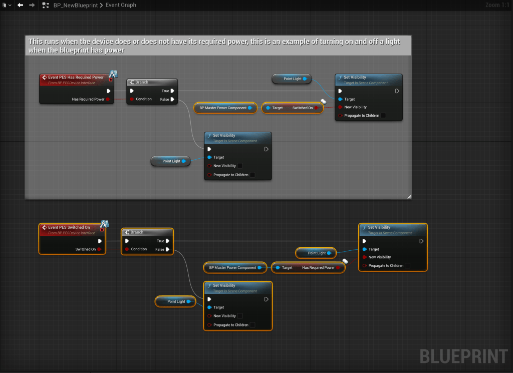 The PES Switched On event runs when the device is switched on or off, this gets run when the player interacts with the blueprint, this code then checks if the device is being turn on or off and if its being turned on it checks if the power component has its required power, if it does turns on the light if it doesn’t the light wont turn on.
