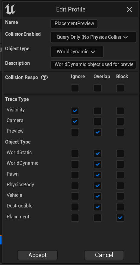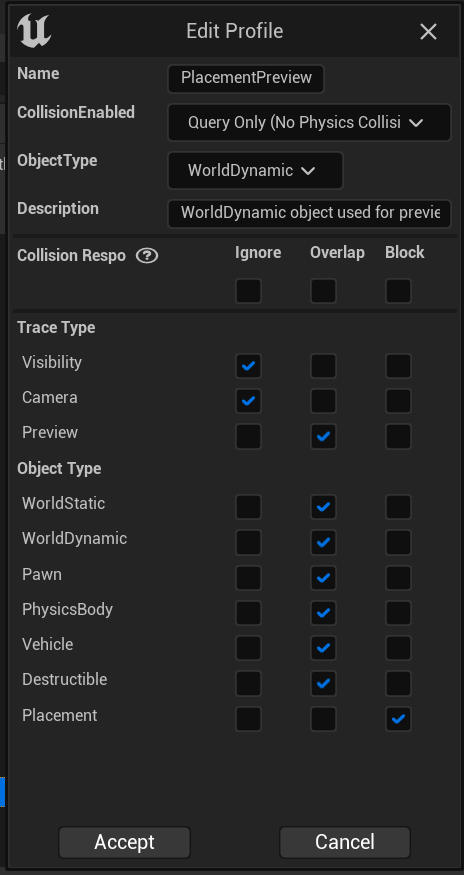 Below are important collision settings you need for Player Electricity System to work correctly, if you migrated the it to another project or have made modifications to the collision settings you may be missing or have an incorrect setting. You may already have some settings set correctly but other might not be so its worth quickly going though and checking all these settings if you are having issues with the placement.