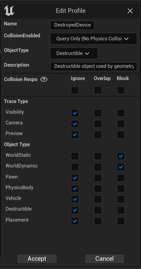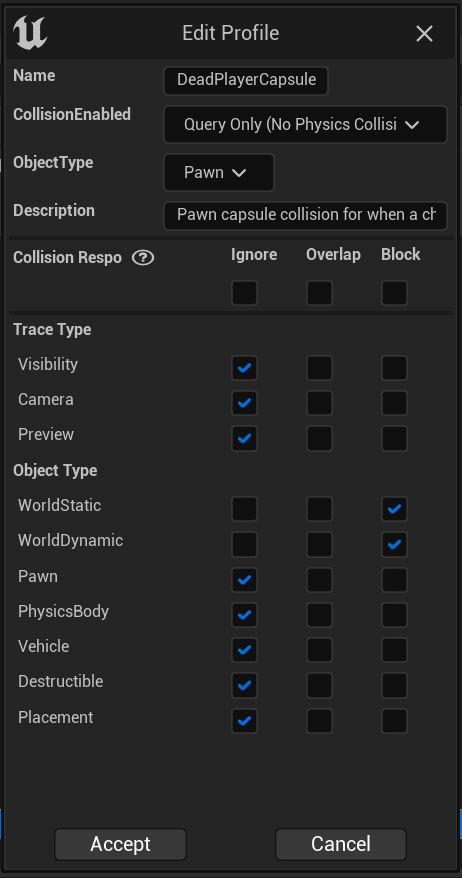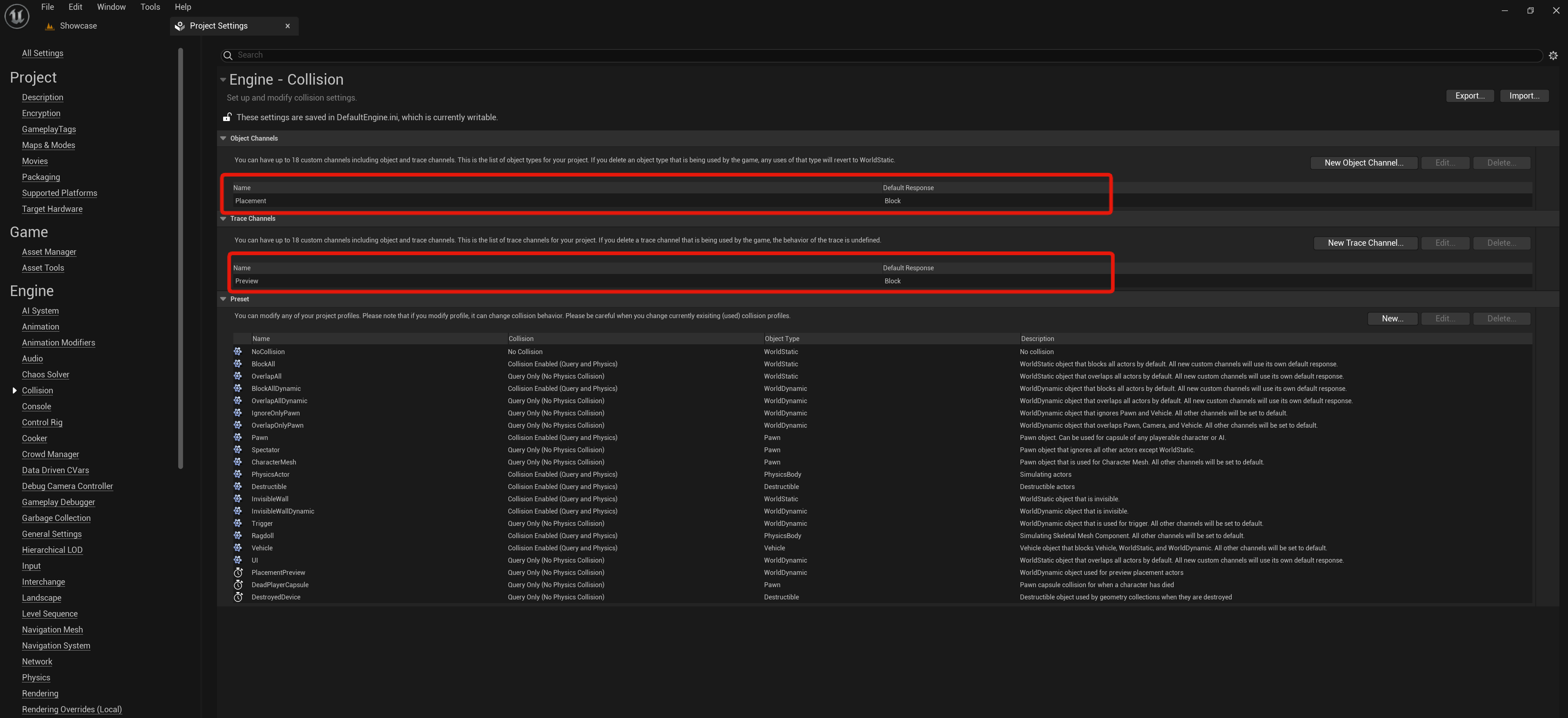 Below is the Collision category in the Project Settings, you must have all the settings shown in the image below, if you are missing any then you can click the Create Object Channel button or the New Trace Channel option to add them depending on which category the setting is missing from. You can also see the default collision response in the image below as well.