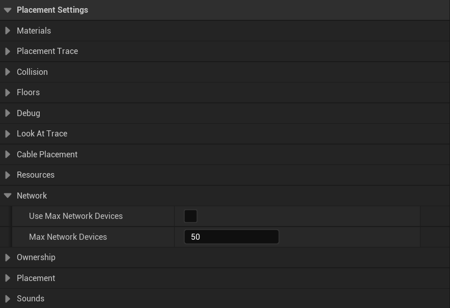 You can find the Max Network Device settings in the BP_PlayerPowerComponent in the Class Defaults find the Placement Settings category then find the Network category.