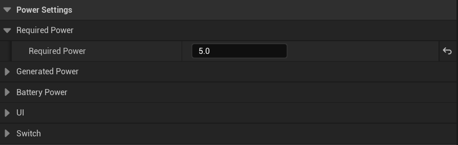 To change a device’s settings go to the device blueprint so for example the BP_WallLight and select the BP_MasterPowerComponent in the Components panel, then in the Details panel find the Power Settings category and in that category you will find the Required Power settings.