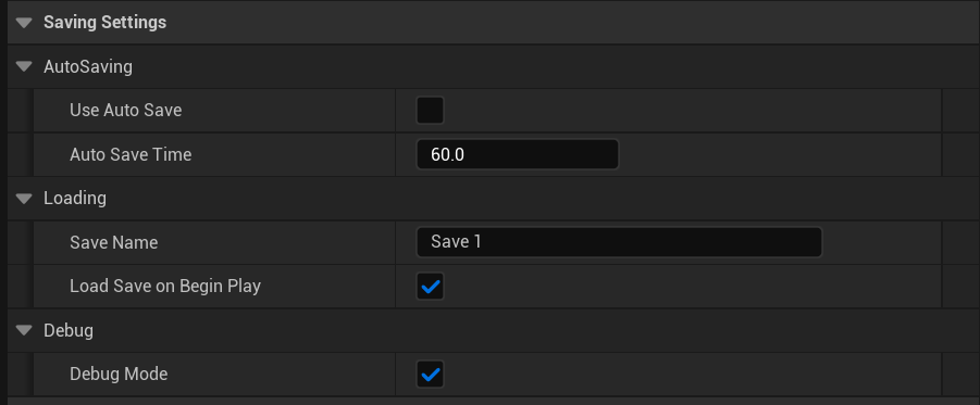 If Load Save on Begin Play is ticked on the save system will attempt to load the save game file when the game starts, the save game file it loads is controlled by the Save Name setting. If no save is found then the save system will do nothing.