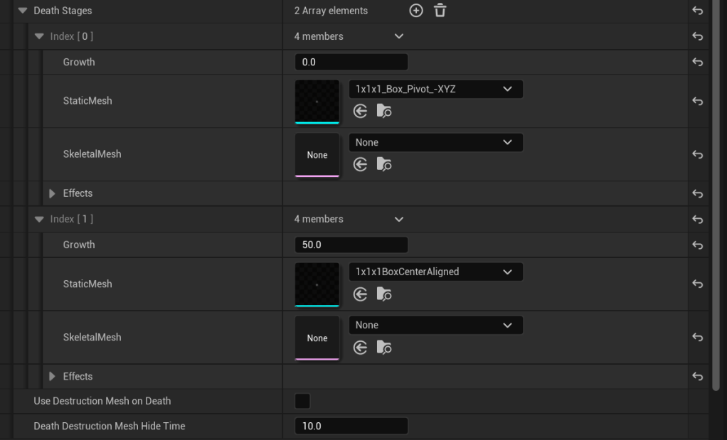 Here you can set the different static or skeletal mesh the plant will use when the plant dies at a certain growth amount. To change when the meshes that will be used you can set the Growth setting for that Index in the Growth Stages setting. Here you can also change the static mesh or skeletal mesh that will be used for that growth value.