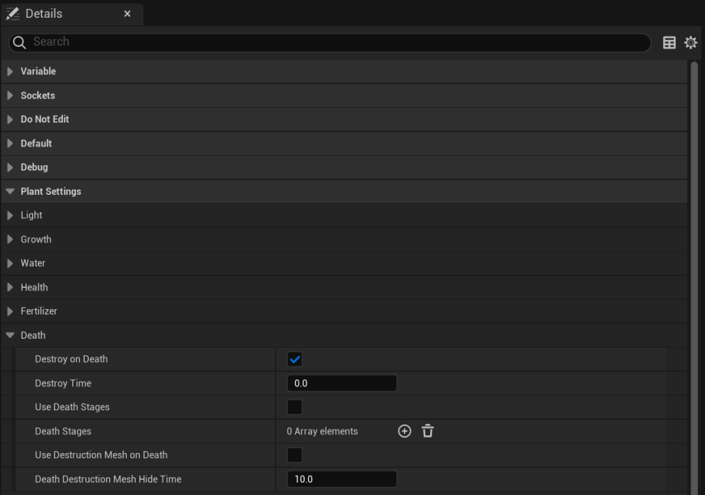 To change a plants death settings go to the plants blueprint so for example the BP_TomatoPlant and select the BP_PlantComponent in the Components panel, then in the Details panel and inside the Plant Settings Category find the Death category like the image below.
