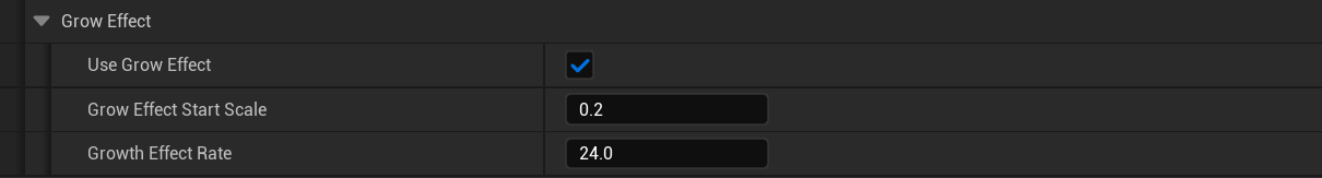 The Growth Effect Rate controls how many times per seconds the plants mesh scale updates. Plants with long grow times like 10 mins or higher should have a low value for this setting like for example between 1 – 3 for the best performance. The default value of 24 is for plants with very short grow times (3 Mins or less) that need to update their scale very frequently.