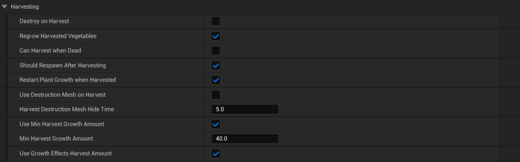 To change a plants Harvesting settings go to the plants blueprint so for example the BP_TomatoPlant and select the BP_PlantComponent in the Components panel, then in the Details panel and inside the Plant Settings Category find the Harvesting category like the image below.