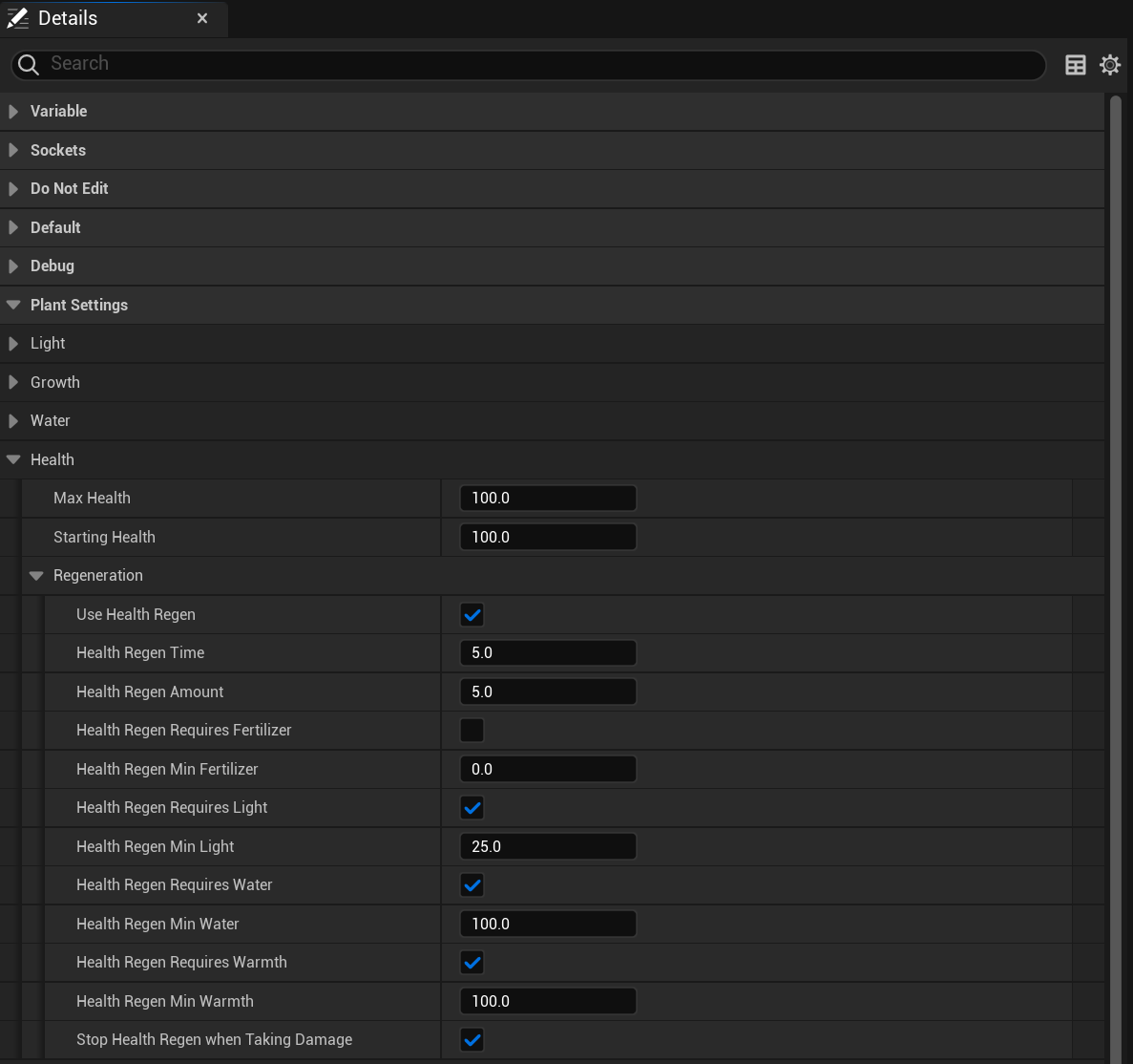 To change a plants Health settings go to the plants blueprint so for example the BP_TomatoPlant and select the BP_PlantComponent in the Components panel, then in the Details panel and inside the Plant Settings Category find the Health category like the image below.
