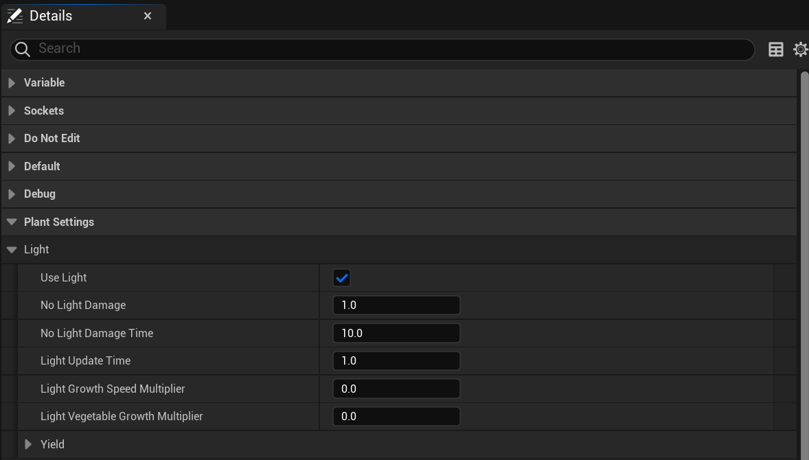 To change a plants Light settings go to the plants blueprint so for example the BP_TomatoPlant and select the BP_PlantComponent in the Components panel, then in the Details panel and inside the Plant Settings Category find the Light category like the image below.