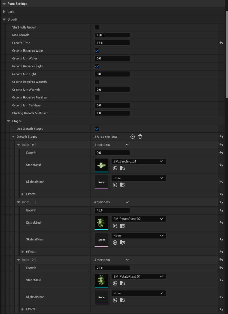 Here you can set the different static or skeletal mesh the plant will use at certain growth amount. To change when the meshes will be used you can set the Growth setting for that Index in the Growth Stages setting. Here you can also change the static mesh or skeletal mesh that will be used for that growth value.