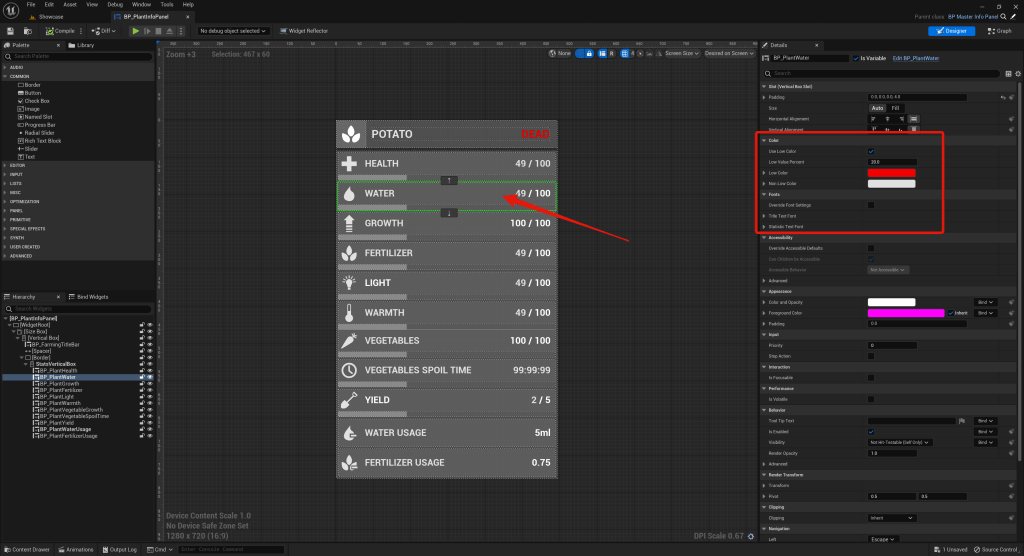 If you want to make additional modification to the stat widgets past the settings available in the BP_PlantInfoPanel you can select the stat widget and click the Edit “Widget name” link in the Details panel shown in the image below.